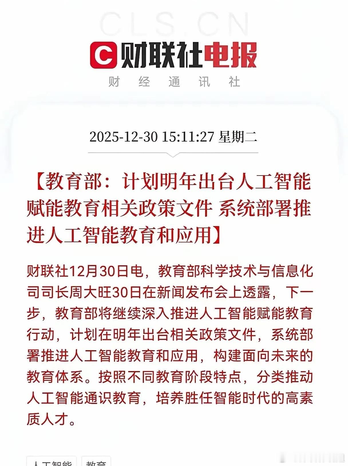 利好总是在盘后!2025年12月30日的财联社电报显示,教育部计划2026年出台人工智能赋能教育的政策文件,将系统部署AI教育与应用,按不同教育阶段推进AI通识教育、构建未来教育体系,旨在培养智能时代高素质人才。该政策将直接推动教育信息化与AI技术的融合落地,利好AI教育产业链上下游相关企业。AI教育受益概念股梳理1. 科大讯飞:AI教育领域龙头,拥有智慧课堂、AI学习机等全场景产品,依托核心语音与认知AI技术,为校园提供智能化解决方案,政策落地将进一步打开其教育业务空间。2. 新东方在线:聚焦在线教育与AI融合,推出AI助教、智能题库等产品,借助直播电商与教育数字化结合的模式,有望承接AI教育普及带来的市场需求。3. 好未来:深耕K12教育数字化,布局AI自适应学习系统,通过大数据与AI技术优化教学内容,政策推动下其智能教育产品的落地场景将持续拓展。4. 视源股份:旗下希沃品牌是教育交互智能平板龙头,产品集成AI课堂管理、学情分析功能,AI教育政策将带动校园智能硬件的更新与采购需求。5. 鸿合科技:主营教育信息化硬件与软件服务,推出AI互动课堂、智慧校园解决方案,与多地院校合作落地AI教学场景,政策利好将提升其订单规模。6. 拓维信息:依托华为昇腾AI生态,为教育行业提供AI算力服务器与智能化解决方案,可支撑校园AI大数据分析、通识教育平台的搭建。7. 神州泰岳:布局AI教育机器人与智慧校园运维系统,通过NLP技术优化教育服务流程,政策推动下其AI教育技术的应用场景将进一步丰富。8. 佳发教育:专注教育考试信息化,推出AI监考、智能阅卷系统,将AI技术融入教育评价环节,政策对AI教育的部署将带动其产品的市场渗透。9. 新开普:主营校园信息化服务,打造AI校园一卡通、智慧教务系统,借助AI技术实现校园管理智能化,有望受益于校园数字化升级的政策东风。10. 竞业达:聚焦智慧教育整体解决方案,推出AI课堂行为分析、虚拟仿真教学系统,深度参与校园AI教育基建,政策落地将加速其项目交付。11. 华平股份:提供教育视频云与AI互动教学系统,支持远程AI教研、虚拟课堂等场景,AI教育的普及将提升其音视频技术在教育领域的应用。12. 二六三:布局企业级在线教育与AI协同办公,推出AI翻译、智能会议系统,可服务于高校跨国AI教育交流、远程教学场景。13. 国新文化:背靠中国电科,整合教育信息化资源,推出AI教育中台与数字教材产品,政策推动下其国资背景将助力其参与校园AI基建项目。14. 全通教育:主营K12家校互动与智慧教育服务,接入AI学情分析、个性化学习推荐功能,AI教育政策将带动其平台用户的活跃度与变现能力。15. 世纪天鸿:聚焦教育出版数字化,利用AI技术开发智能教辅、题库系统,将传统教辅与AI自适应学习结合,有望承接AI通识教育的内容需求。16. 方直科技:深耕中小学教育软件,推出AI英语学习、虚拟实验等产品,与各地教育部门合作推进AI教学试点,政策利好将加速其产品推广。17. 盛通股份:旗下乐博乐博专注机器人教育,融合AI编程教学体系,契合AI通识教育的培养方向,政策推动下青少年AI教育市场将迎来扩容。18. 豆神教育:布局AI大模型在语文教育的应用,推出AI作文批改、国学通识教育系统,依托大模型技术优化教育内容生产,受益于AI教育内容创新政策。19. 中南传媒:省级出版传媒龙头,利用AI技术升级数字教育内容,打造智慧教育平台与AI教辅资源库,政策将推动其教育数字化业务的增长。20. 皖新传媒:主营教育图书发行与智慧教育服务,搭建AI教育云平台,整合线上线下教育资源,AI教育政策落地将提升其教育服务的附加值。总结教育部计划出台的AI赋能教育政策,为AI教育板块带来明确的政策红利,教育信息化硬件、AI教育工具研发、教育内容数字化等细分领域的企业将直接受益。政策推动下,AI技术与教育场景的融合将加速落地,行业不仅迎来市场需求的扩容,还将推动技术迭代与商业模式创新,AI教育产业链的中长期发展空间被全面打开。本文涉及资讯、数据等内容来自网络公共信息,仅供参考,不构成投资建议!