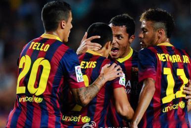 【西甲-内马尔传射桑切斯2球 巴萨4-1逆转8连胜领跑】北京时间10月6日04:00,2013/14赛季西班牙足球甲级联赛第8轮一场焦点战在诺坎普球场展开争夺,巴塞罗那主场4比1大胜巴拉多利德,格拉率先破门,桑切斯梅开二度,内马尔传射建功,哈维打入一球。巴萨夺得联赛8连胜领跑。西甲