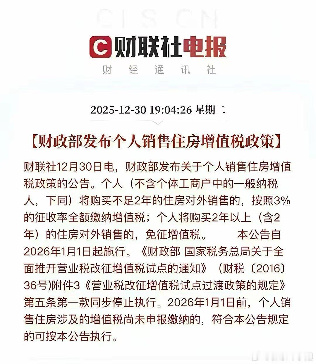 增值税2026年1月1日起,不满两年的二手房交易增值税从5.3%降到3%✅对交易双方:直接降成本。例:300万未满2年房源,增值税从15万降至9万,省6万;成本易在买卖间传导,买家也能受益。简化规则,不用再纠结普通/非普通、各地口径,交易更省心。✅对市场:提升流动性,降低“短持”房源抛售成本,缓解房东“解套”压力;激活刚需与改善,促进存量房流通,带动装修、家居等下游消费。✅对行业:稳定预期,传递托底楼市、支持自住的信号;降低中介交易阻力,加速成交周期,利好二手房经纪业务