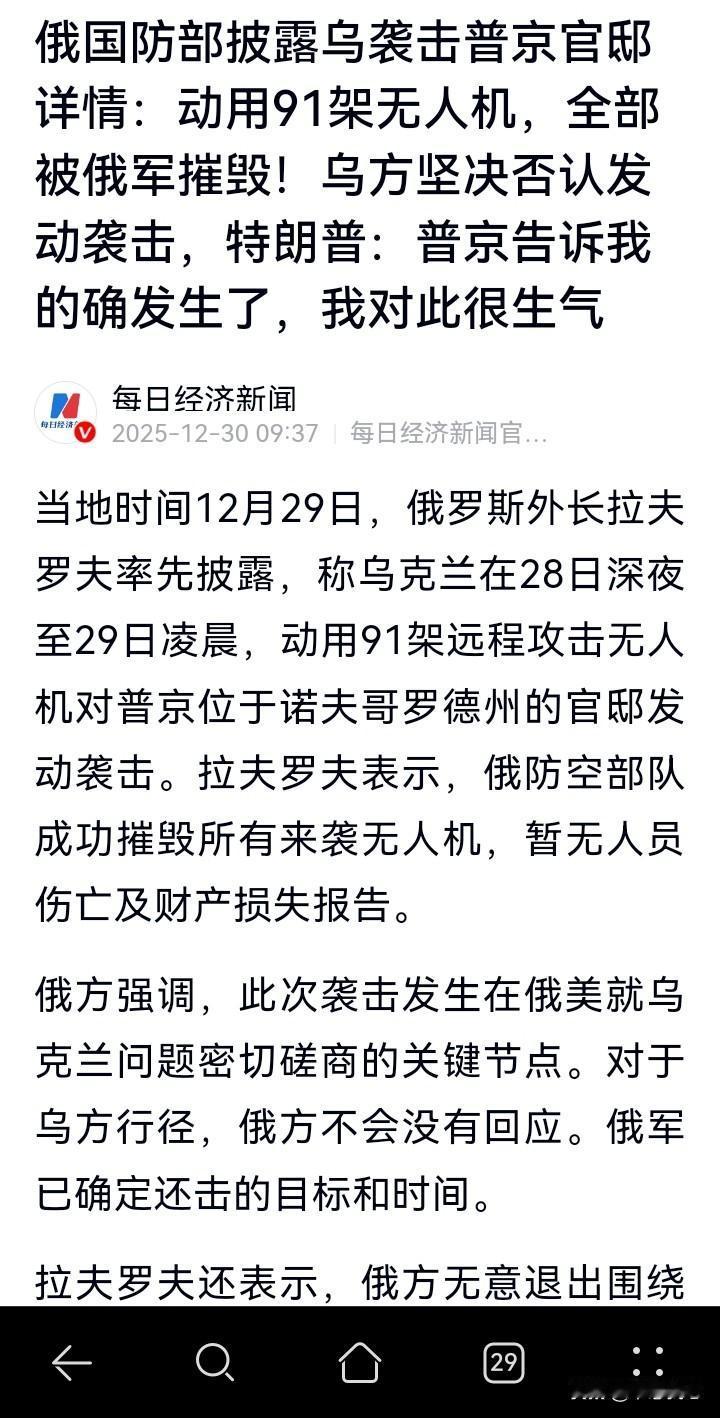 对一国首脑的攻击,被视为宣战,而对普京的攻击,应该是能触发三战的…… 记得就这些年,俄罗斯和西方交恶,特别是俄罗斯和乌克兰打起来后,类似的情况起码发生过两次了。此前,有一架客机被导弹打下来,据说是它被误以为是普京的专机! 然后这次,乌克兰出动无人机对普京的攻击,之前也发生过一次,那是对普京专机发动袭击,而这次是袭击普京的官邸。 好在这几次,普京都平安无事,但是,从此可知,乌克兰以及西方国家,真是胆儿肥了。 希望他们之间的昴宿呢,能及时对话解决吧。不然,哪次普京真正发怒了,那可不敢想象……普京俄乌冲突 如何看待俄称乌无人机袭击普京官邸