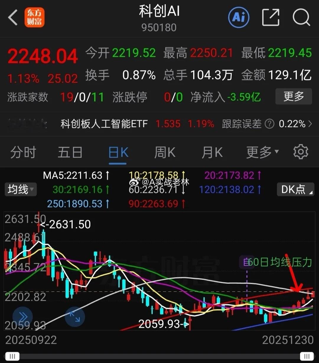 科创Ai(科创人工智能),昨天突破60日线压力失败,今天再次冲击60日线压力,目前盘中已经突破了60日线(如下图所示),主力做多意愿坚决,假如有效突破站稳60日线支撑,后市打开上涨空间,可继续持仓待涨,逢跌低吸。前期它明显落后创业板人工智能,后面有望轮动补涨。