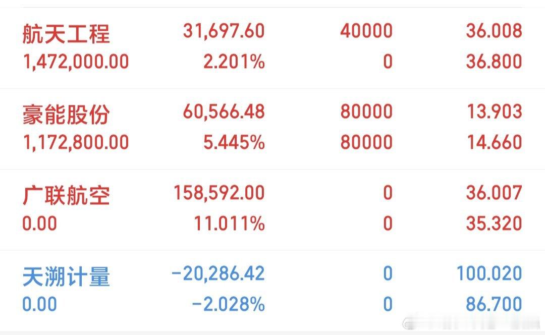 卖出:$广联航空 sz300900$ 超预期大幅高开出现明显出货尖峰,40元清仓了,盈利11%收益,大肉。亏1.6%.卖出:$天溯计量 sz301449$ 开盘大幅下跌,远远不如预期,按策略清仓了,亏2%.持有:$豪能股份 sh603809$ 5.4%盈利。买入:$航天工程 sh603698$ 按策略下杀至36元买入,2.2%盈利.看到的朋友点个赞,馆长每天坚持发出自己的操作记录,老铁们,点赞富三代,评论美一生!特别声明:这只是我个人的操作记录,不作为任何投资建议,更不是劝你们跟买,股市有风险,投资需谨慎!