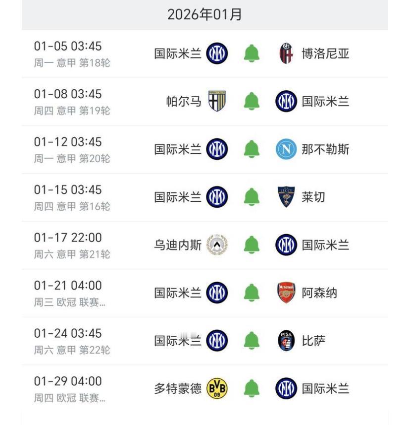 真变态!2026年1月国际米兰将迎来史无前例的魔鬼赛程,堪称变态。自1月5日起至1月29日,这24天时间国际米兰将出战8场比赛,平均3天一战。这赛程对平均年龄偏大的国际米兰而言确实是个极大的考验。 1月份的战绩或将对国际米兰本赛季的成绩有着至关重要的影响。毕竟不乏联赛对阵苦主博洛尼亚和主要竞争对手那不勒斯,欧冠对阵阿森纳和多特蒙德等重要且关键的比赛。这几场比赛事关联赛争冠前景和欧冠出线。 无论赛程如何恐怖,期待国际米兰众将士拿出百分百的能量去面对,取得好成绩。