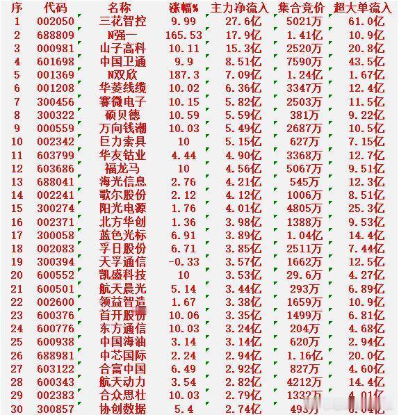 12月30日收盘,主力资金“大幅买入”的30名单:三花智控:涨幅+9.99%(接近涨停),净流入27.6亿元N强一:涨幅+165.53%,净流入17.9亿元山子高科:涨幅+10.11%(涨停),净流入15.3亿元中国卫通:涨幅+9.90%(涨停),净流入8.51亿元N双欣:涨幅+187.30%,净流入7.09亿元华菱线缆:涨幅+10.02%(涨停),净流入6.36亿元赛微电子:涨幅+10.15%(涨停),净流入5.82亿元硕贝德:涨幅+10.59%(涨停),净流入5.59亿元万向钱潮:涨幅+10.03%(涨停),净流入5.49亿元巨力索具:涨幅+10.00%(涨停),净流入5.15亿元华友钴业:涨幅+4.44%,净流入4.90亿元福龙马:涨幅+10.00%(涨停),净流入4.56亿元海光信息:涨幅+2.76%,净流入4.21亿元歌尔股份:涨幅+2.12%,净流入4.12亿元阳光电源:涨幅+1.76%,净流入4.01亿元