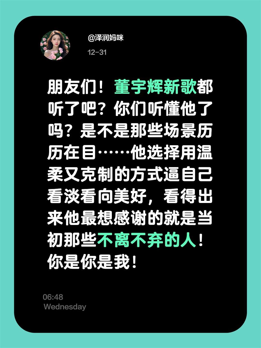 朋友们!董宇辉新歌都听了吧?你们听懂他了吗?是不是那些场景历历在目……他选择用温柔又克制的方式逼自己看淡看向美好,看得出来他最想感谢的就是当初那些不离不弃的人!你是你是我!