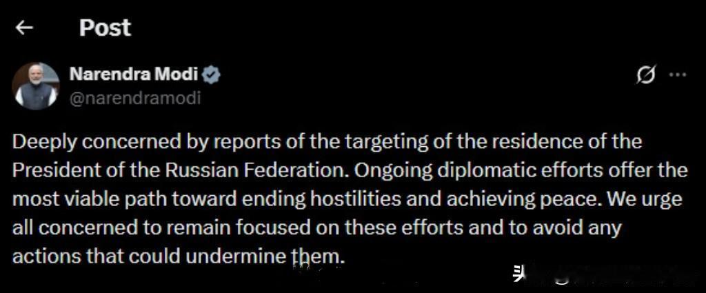 印度和巴基斯坦分别就乌克兰无人机袭击普京官邸事件发表声明 巴基斯坦总理谢赫巴兹·谢里夫: 巴基斯坦谴责据报道针对俄罗斯联邦总统弗拉基米尔·普京阁下住所的袭击行为。 这种令人发指的行径对和平、安全与稳定构成了严重威胁,尤其是在各方正为实现和平而努力之际。 VS 莫迪老仙: 对俄罗斯联邦总统官邸遭袭击的报道深感关切。 正在进行的外交努力是结束敌对行动、实现和平的最可行途径。 我们敦促所有相关方继续专注于这些努力,避免采取任何可能破坏这些努力的行动。 巴基斯坦的回应更加直接,三哥则圆滑依旧。