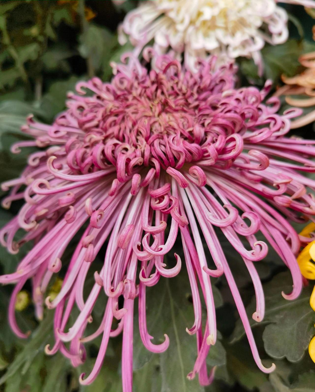 晒图笔记大赛这朵菊花如一团精致的粉色烟花,层层叠叠的花瓣卷曲如俏皮的发梢,从花心向外舒展。深粉与淡紫交织的花瓣边缘泛着柔和的光泽,细密的纹路在阳光下清晰可见,仿佛被巧手精心烫过的卷儿。背景中隐约可见的白菊与黄菊更衬得它娇艳欲滴,翠绿的叶片托举着这团锦绣,尽显秋日独有的绚烂与风骨。每一道弯卷都藏着自然的匠心,在萧瑟时节绽放出最热烈的生命力。