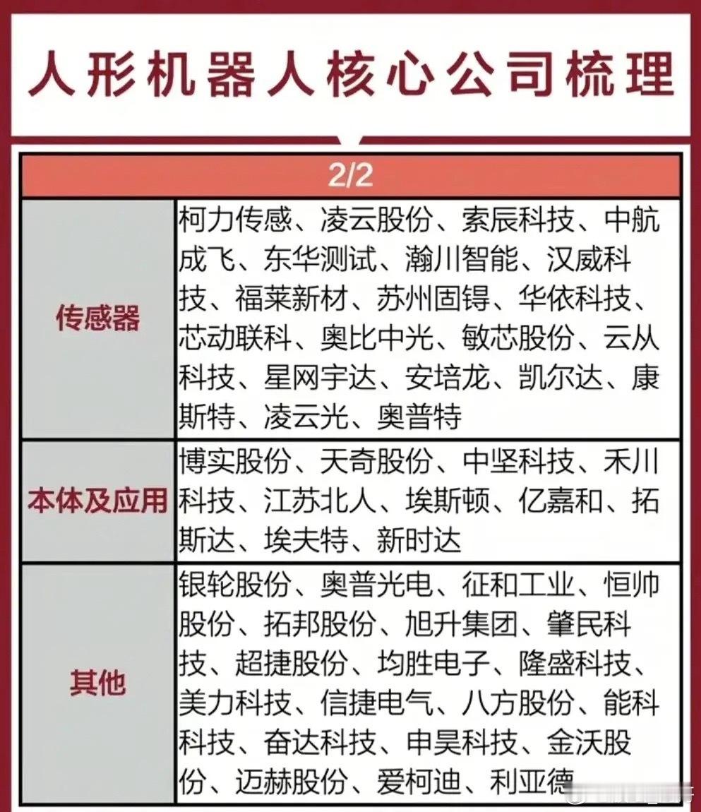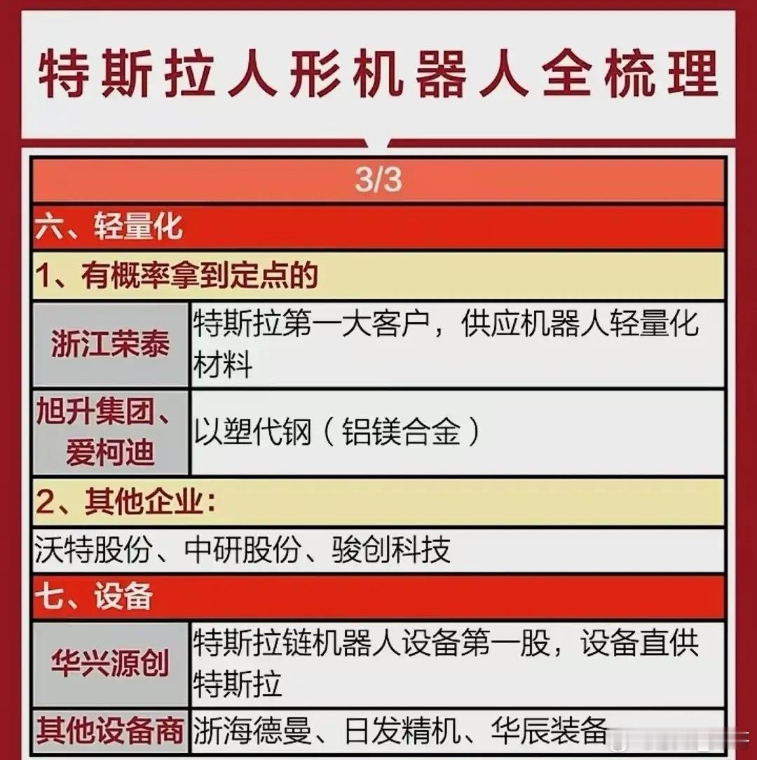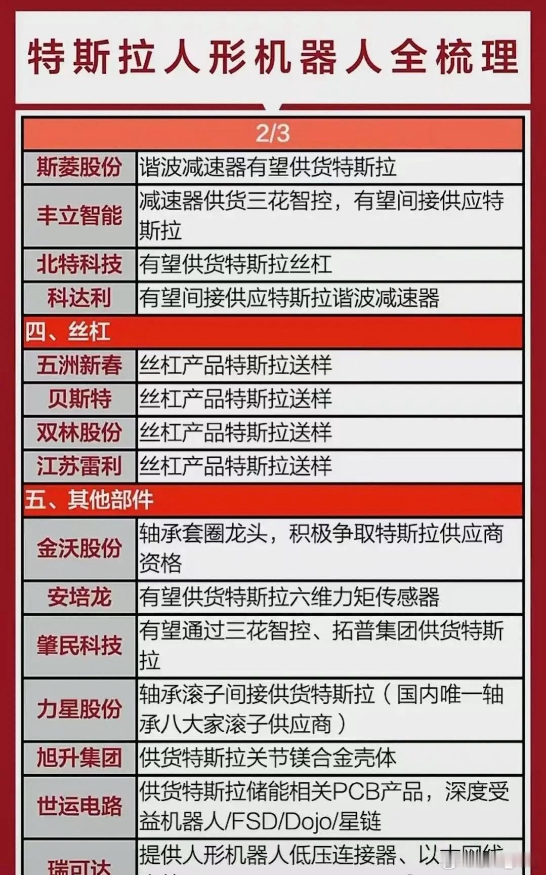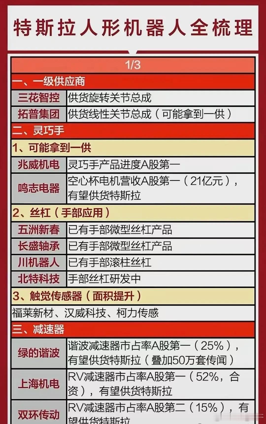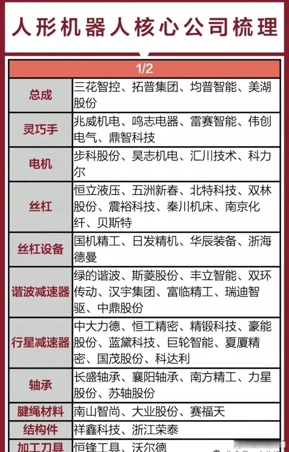 人形机器人概念利好来袭:12月26日,工信部人形机器人与具身智能标准化技术委员会成立;宇树科技全国首店12月31日北京京东MALL开业,加速C端落地;特斯拉Optimus项目发包预期升温,供应链企业密集对接。相关概念龙头企业有哪些?2025年12月特斯拉审厂通过的中国企业有七家:三花智控(一级供应商)、拓普集团(关节供应商)、卧龙电驱(电机供应)、五洲新春(丝杆供应商)、长盈精密等等。人形机器人赛道迎来政策、量产、技术多重利好,行业加速迈入标准化与规模化阶段。从总成、灵巧手、电机、减速器等核心零部件,到传感器、本体及应用环节,行业龙头代表名单见配图。