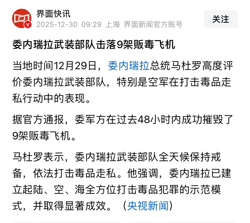 委内瑞拉在48小时内摧毁9架贩毒飞机,可见特朗普没有冤枉马杜罗,委内瑞拉确实贩毒问题严重。不过在这之前委内瑞拉在干什么?是不作为还是故意放纵? 之前美国认定委内瑞拉太阳集团是参与贩毒的恐怖组织,认定委内瑞拉每年都向美国输送毒品,委内瑞拉坚决否认。不过现在看来既然委内瑞拉贩毒问题如此猖獗,那么这种否认也就苍白无力,如此猖獗的贩毒难道最终都在委内瑞拉国内消化?恐怕没几个人会信!