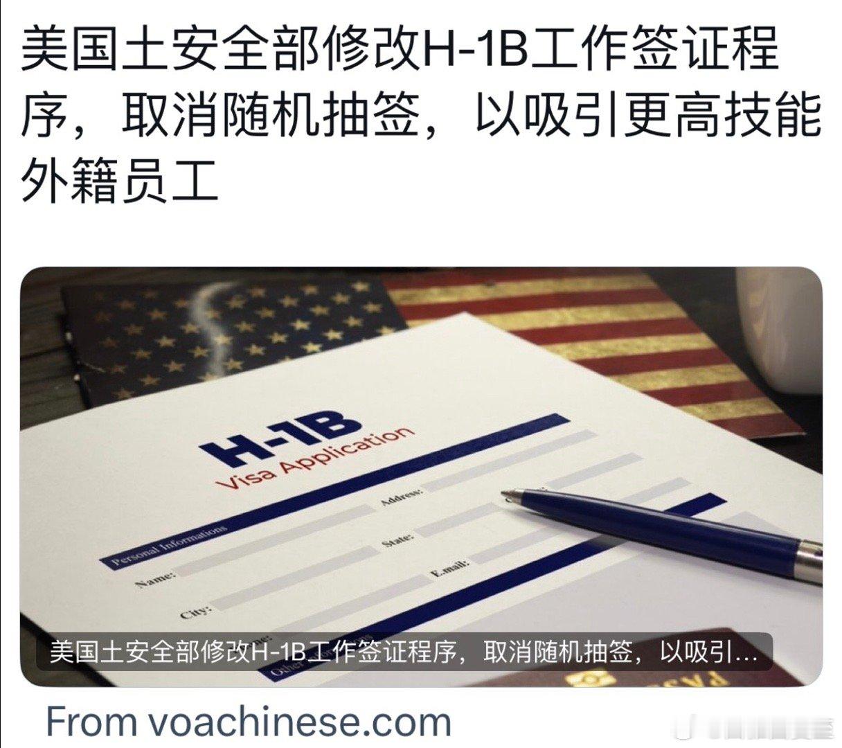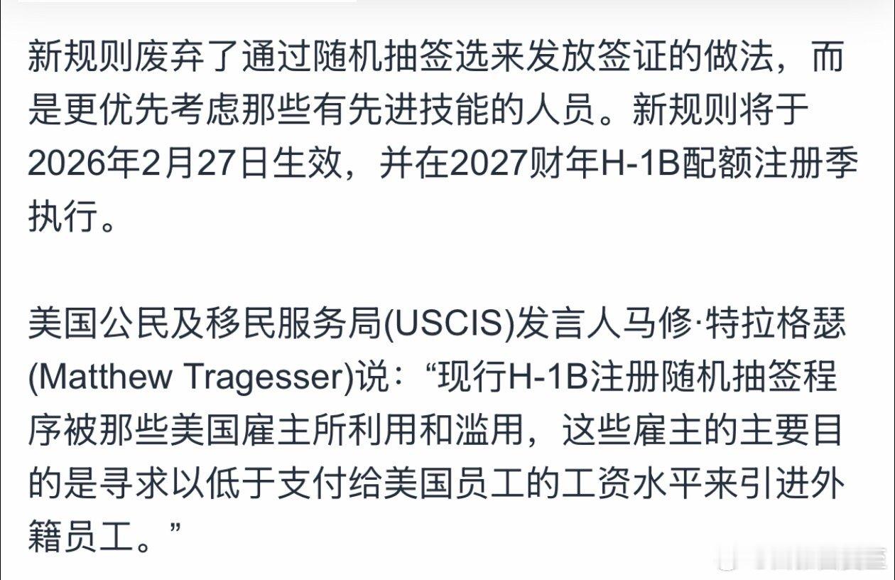美国H-1B工作签证新规:取消申请人“随机抽签”,优先考虑拥有“先进技能”的外籍员工2026年2月27日起生效H-1B工签,每年新名额八万五千