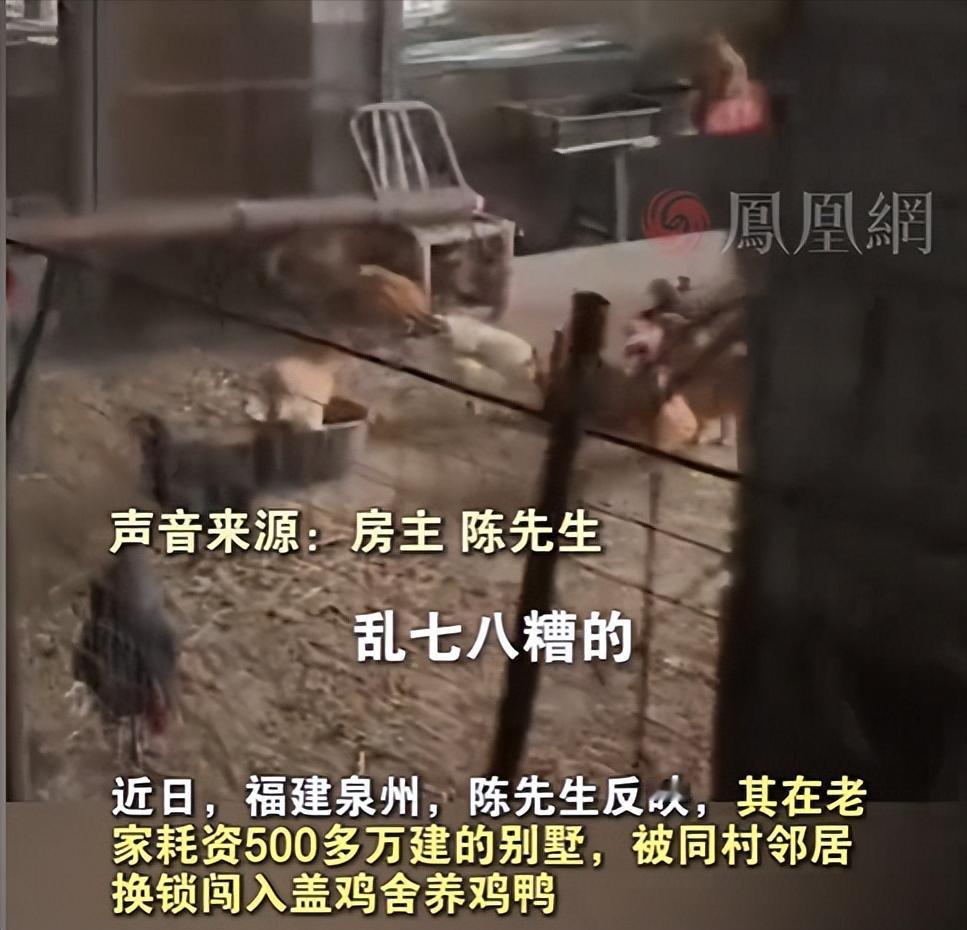 谁能想到,花 500 多万建的别墅,空置着竟被邻居当成 “私人养殖场”!福建泉州陈先生的遭遇,看完只剩咬牙的愤怒 —— 冬至回乡祭祖,一进地下室就被恶臭熏懵,好好的房子,竟被隔壁邻居撬锁闯进来,改造成三四个鸡舍,四五十只鸡鸭满地乱窜。 鸡粪、饲料残渣堆得满地都是,老鼠脚印随处可见,墙面、地面装修被粪水浸泡得面目全非,好好的别墅彻底成了 “臭作坊”,根本没法住人。更过分的是,邻居不光占了地下室,还私自换了储藏间门锁,堆满自己的工具、铁笼,把别人的家当成了自己的仓库。 陈先生当场报警立案,可这邻居半点不收敛,竟多次偷偷潜入,连夜转移鸡鸭和屋内财物,这已经不是邻居第一次作案 —— 两年前,陈先生同村的闲置厂房,就被他破锁闯入养禽,当时投诉无果,没人管,如今才敢变本加厉。 目前,该行为已涉嫌非法侵入住宅罪、故意毁坏财物罪,即便不够刑事标准,也违反治安管理处罚法。陈先生已保留全部证据,坚决依法追究其赔偿责任。