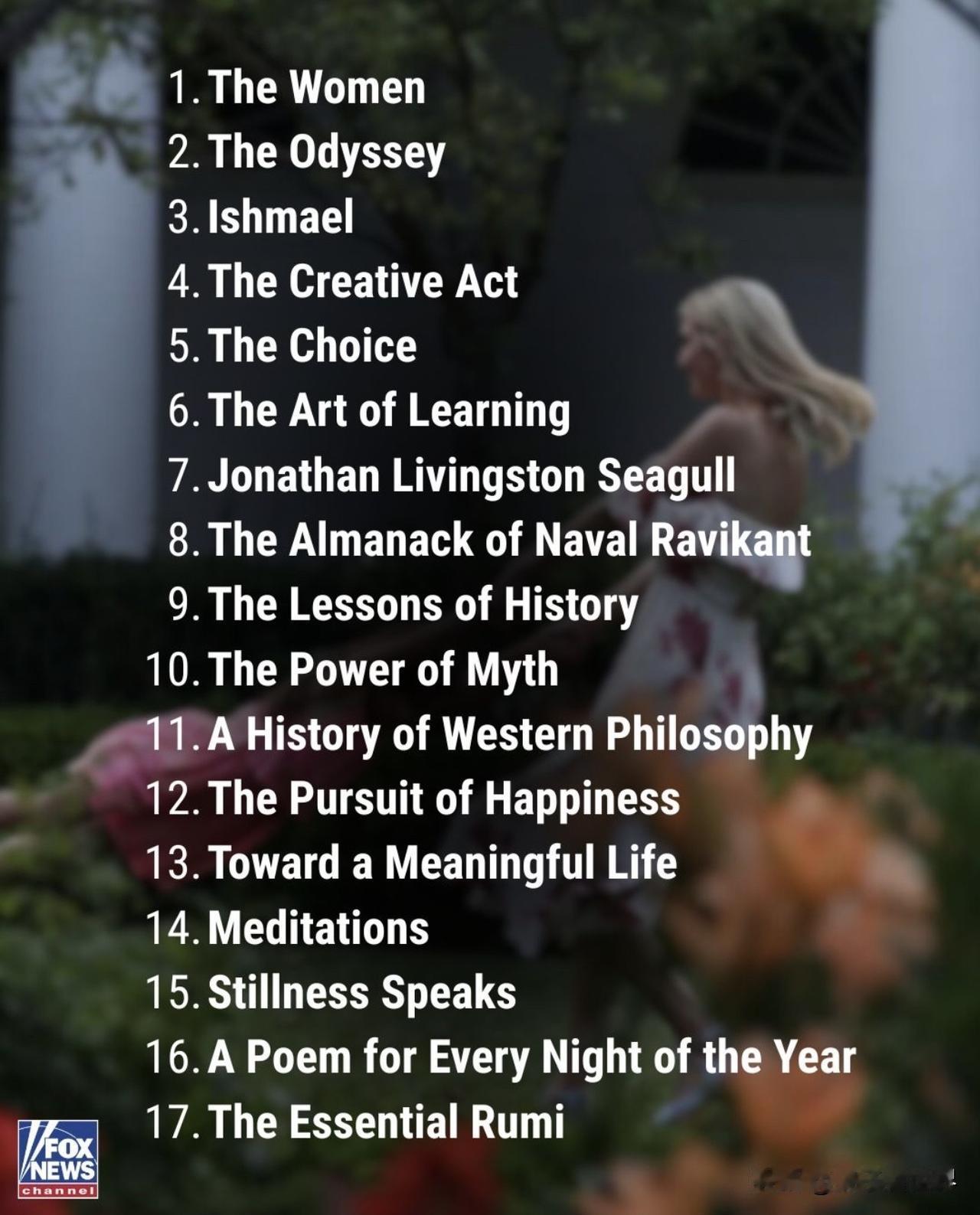 美國「第一公主」伊萬卡公布了她2025年的閱讀書單,稱對她都有不同程度的影響。 Ivanka Trump posts a curated reading list from 2025 and invites recommendations for the year ahead from her X audience. "Each one shifted my perspective, some softly, others profoundly."