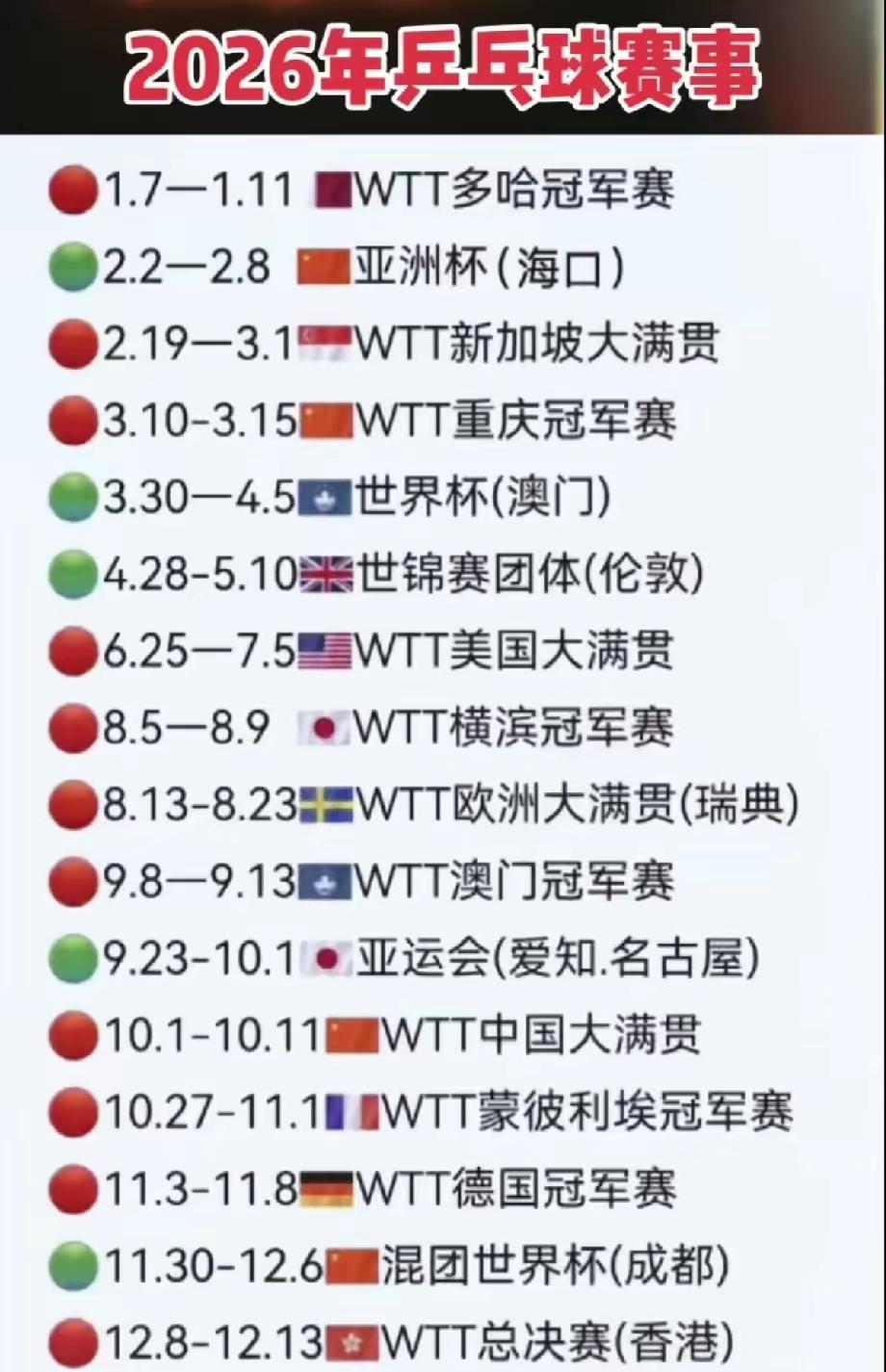 2026年 关注国乒参加的16站乒乓球顶级赛事! 国际乒联举办的包括世界杯、世锦赛和混团世界杯三站比赛。 亚乒联举办的亚洲杯、亚运会两站比赛。 WTT举办的四站大满贯赛、六站冠军赛和一站年终总决赛共11站比赛。
