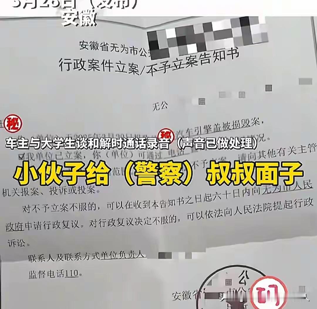 这回四名大学生可"踩”到了钢板上。 安徽无为市有4名大学生,为了拍出心仪的照片,居然踩在一辆汽车的引擎盖上,导致引擎盖凹陷。 车主回来以后查看监控,才知道引擎盖凹陷的原因。没办法,他只能先花了9505元去修车。 事后,车主报了警,警察也很快的找到了当时拍照的四名大学生,都是在校读书的学生。 找到学生以后,学生认为车主在讹钱,不愿意接受调解,得走法律途径定损,不是车主说多少就多少。 车主一怒之下,他可以一毛钱不要,也得让四名大学生留下案底长点记性。 定损金额超过5000块钱就可以立案了。 也许是理亏,或是担心真留案底的话,一辈子找工作干什么都受影响。 学生们选择了赔偿并道歉。 车主如果坚持立案调查,学生们大概就会有案底,跟随一辈子。 幸亏车主也是一个通情达理的人。 汽车踩钉子 踩钢板