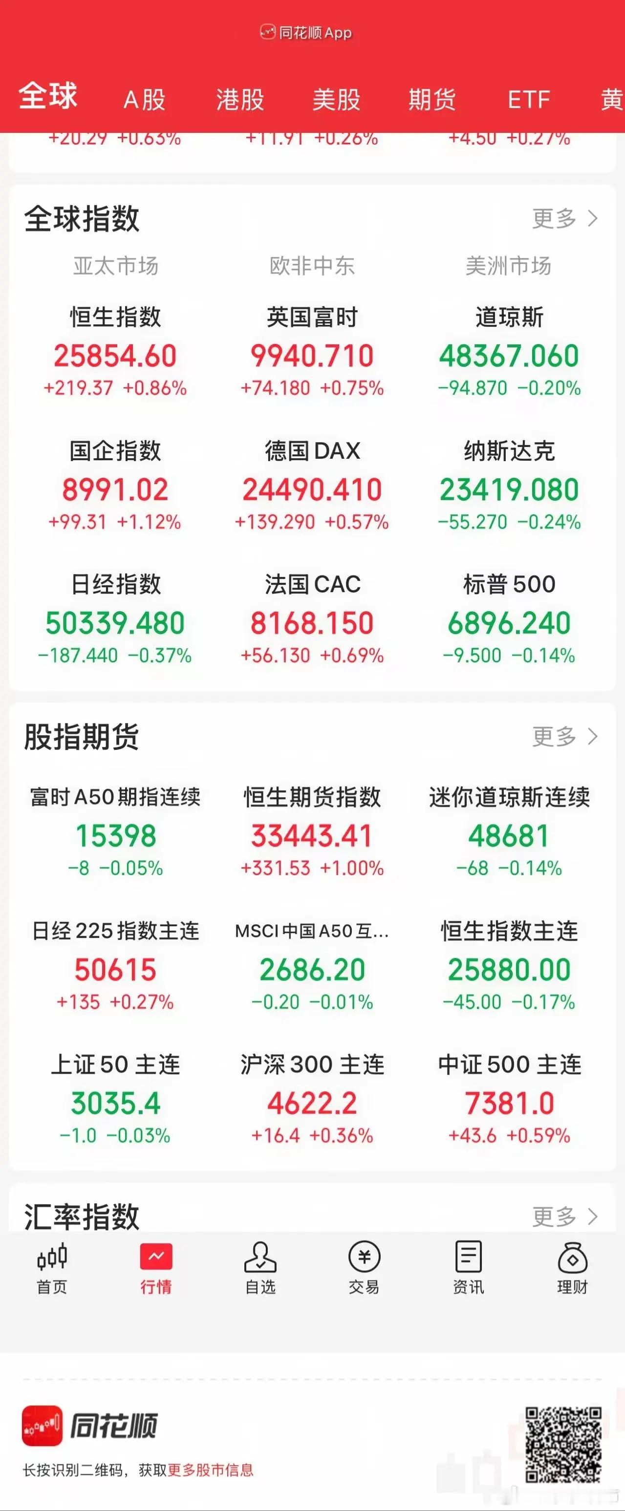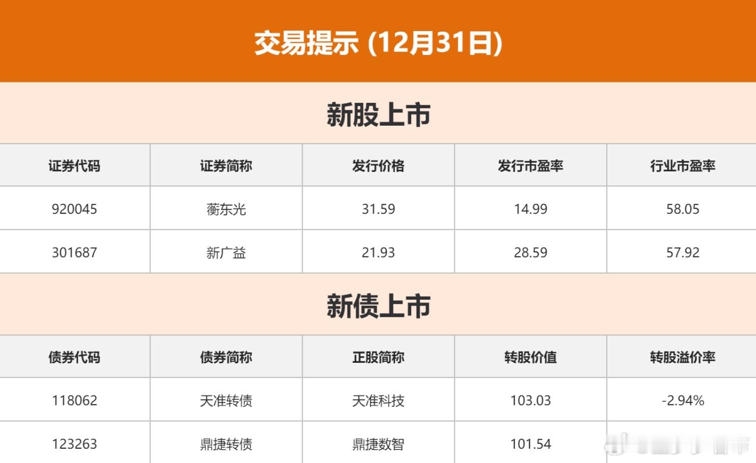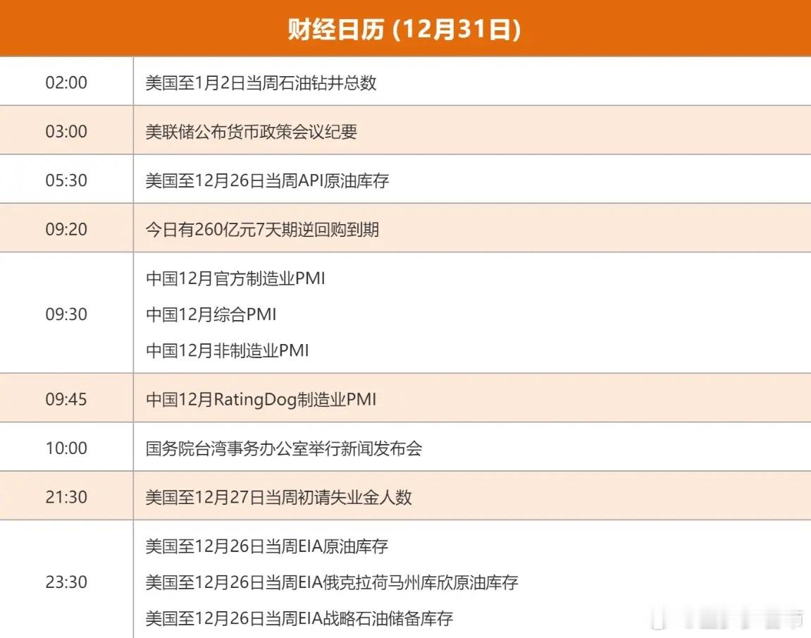 12.31股市早知道:1、外盘汇总:还是小跌,如图一。 2、交易提示:如图二。 3、财经日历:如图三。 4、三大指数:1)大盘:继续看涨2)创指:新目标34703)科创50:继续看涨 5、重要新闻:1)教育部:计划出台人工智能赋能教育相关政策文件,部署推进人工智能教育和应用;2)工信部等四部门印发《汽车行业数字化转型实施方案》;3)农业农村部:多油并举提高大豆油料产能和自给率,大力发展现代畜牧业、现代渔业;4)财政部、税务总局发布个人销售住房增值税政策:不满2年按3%全额缴纳,2年以上免征;5)发改委、财政部:2026年个人购买手机、平板、智能手表手环、智能眼镜等4类产品 给予15%补贴。 6、市场动态:1)海南三大机场旅客年吞吐量首次破5000万人次,创历史新高;2)《北京市医疗健康领域支持人工智能产业创新发展若干措施(2026-2027年)》印发;3)广东:推进人工智能产业高质量发展和全域全时全行业高水平应用。 7、公司公告:1)蓝思科技:完成全年超3000台人形机器人、1万台四足机器狗交付;2)紫金矿业:2025年净利润同比预增59%-62%;3)恒达新材:股东龙游联龙拟减持不超3%公司股份;4)国投中鲁:拟发行股份购买中国电子工程设计院100%股份,交易价格为60.26亿元;5)中信特钢:全资子公司拟15.1亿元收购富景特100%股权,后者控股全球三大独立钢铁贸易商之一斯坦科集团;6)盐湖股份:拟46.05亿元现金收购五矿盐湖51%股权,加快推进世界级盐湖产业基地建设;7)弘讯科技:股东帮帮忙拟减持不超3%股份;8)盛新锂能:拟20.8亿元收购启成矿业30%股权,后者300万吨/年木绒锂矿正在推进开发建设。(关注点赞+评论,陪你一起到牛市)财经今日A股优质财经分享