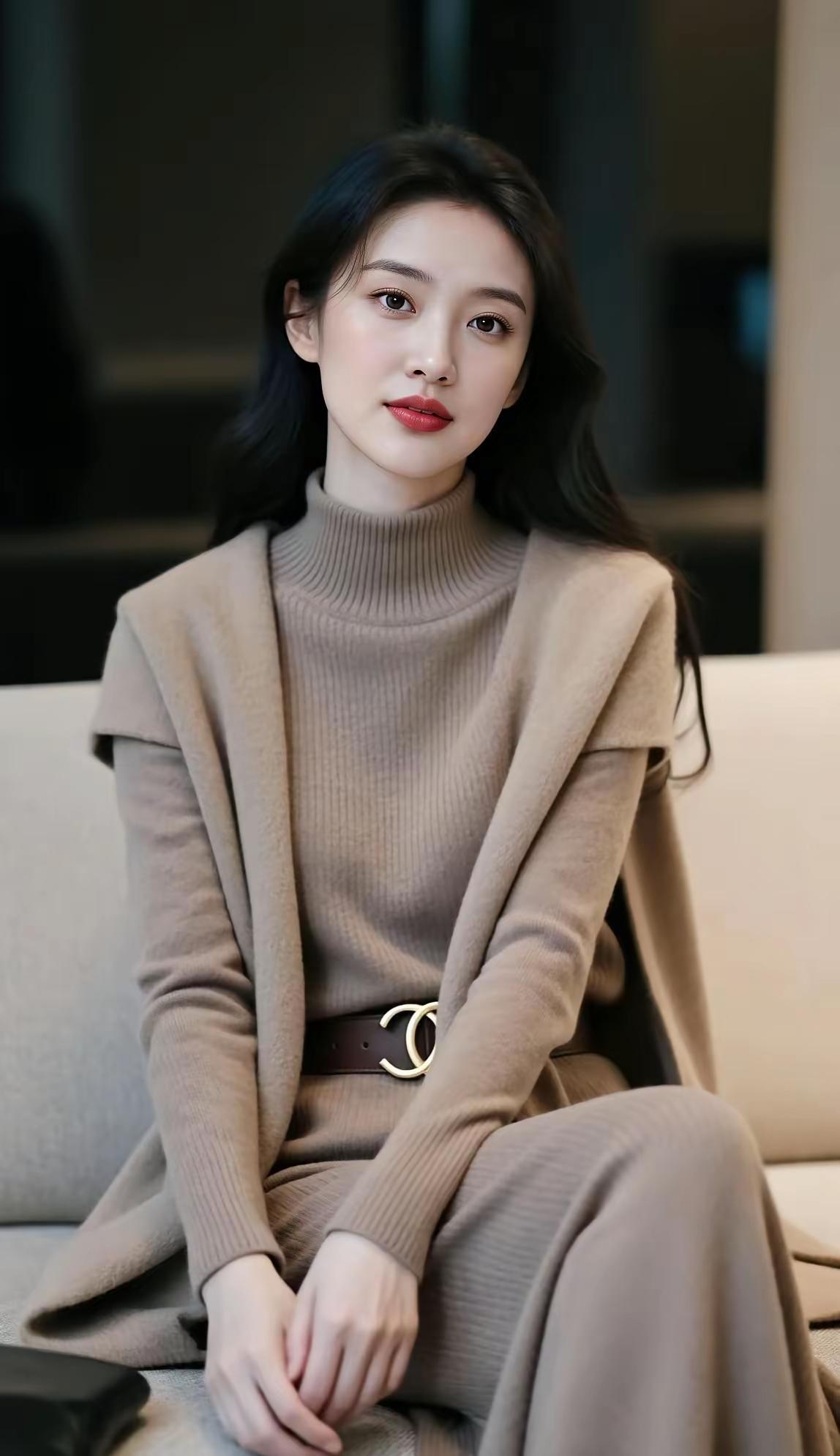 温柔优雅的秋冬穿搭,米色毛衣搭配同色系外套,尽显时尚与温暖。