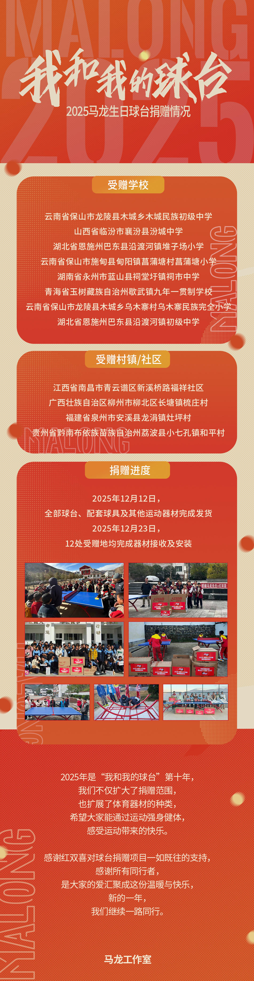 #马龙球台捐赠已经十年了# 马龙球台捐赠项目已经第十年了凭借对乒乓球的热爱,将球台与体育器材送到了更多角落,希望让运动的快乐触手可及,让热爱的力量在广阔的天地里生根发芽新的一年,我们继续用爱照亮更多可能#马龙我和我的球台##马龙#