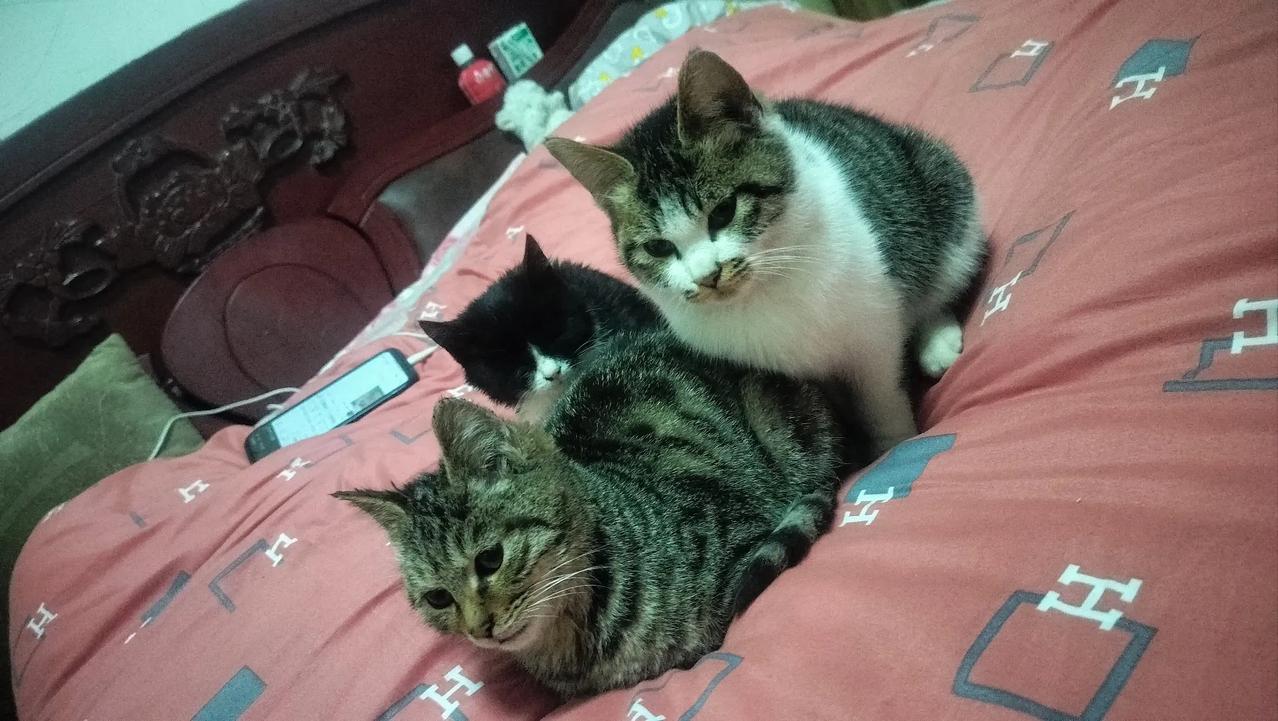 看我家里这几只猫凑一块儿就跟叠罗汉似的,大狸花瘫在最下面当“底座”,身上还压着个小黑猫,小黑猫的眼睛也黑乎乎的都看不到了[捂脸],白棕花纹的那只蹲在后面,探头探脑的,也想挤进来凑热闹。一个个都把床当成自己的地盘了,软乎乎地堆在一起,看着就暖乎乎的。有时候想挪个位置都不敢动,生怕惊扰了这群小祖宗,只能由着它们霸占床铺,谁让它们这么可爱呢。 你们喜欢小猫咪吗?