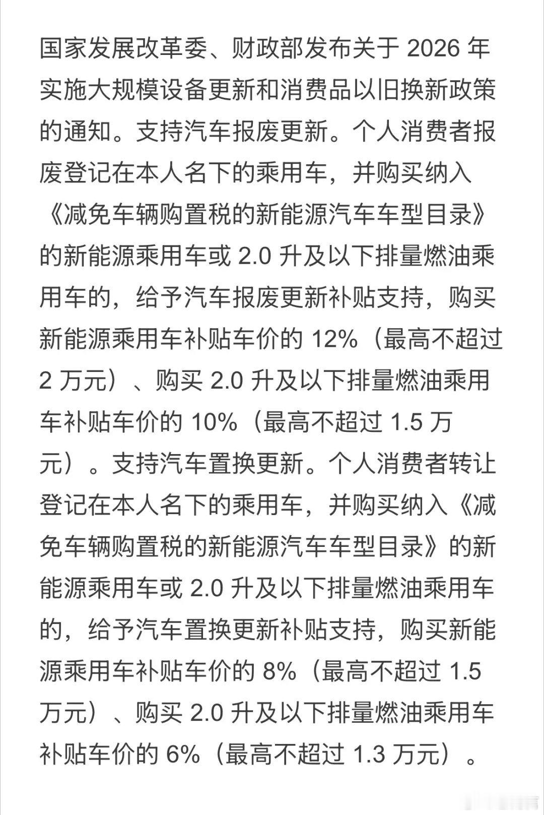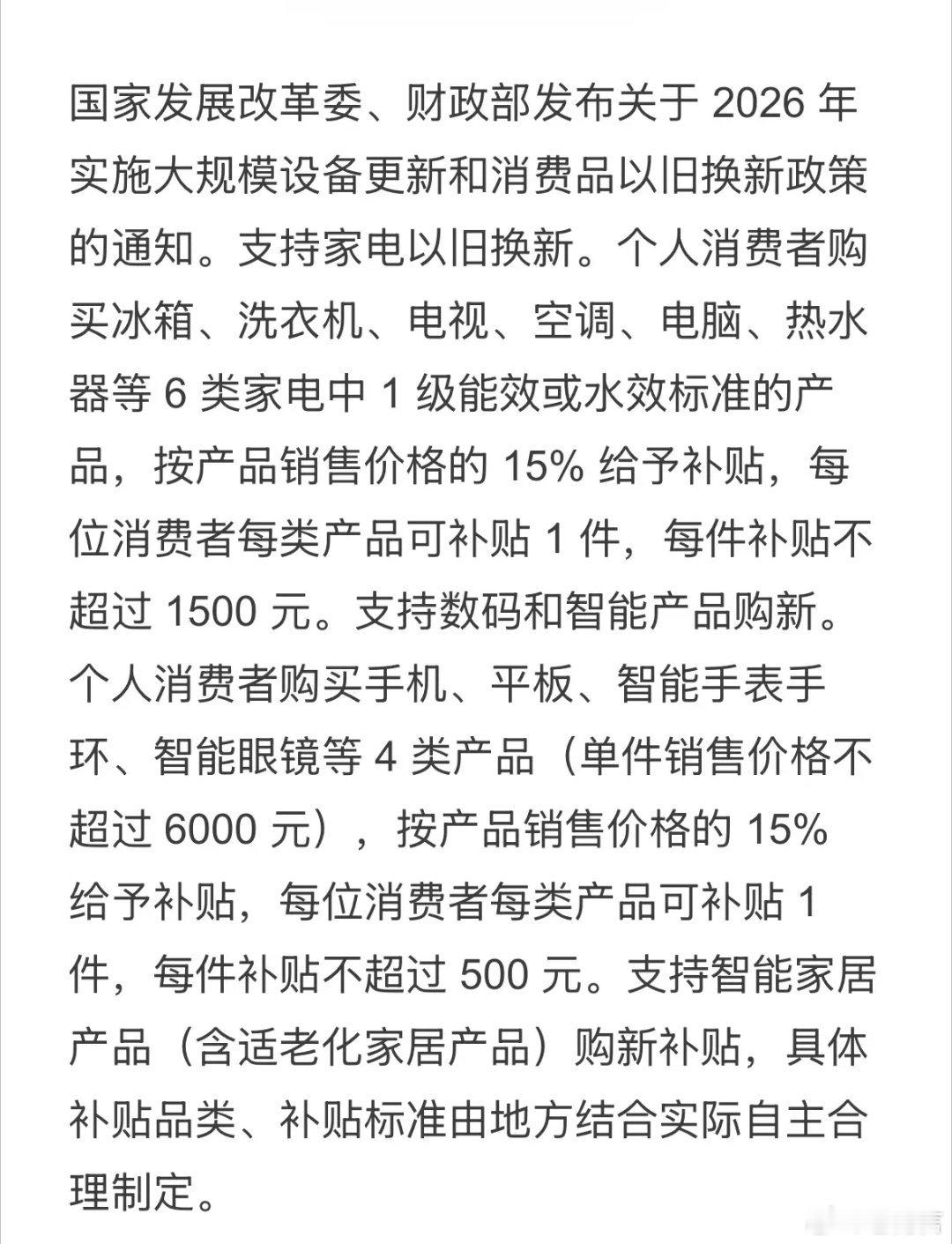 2026年两新政策部署来了2026年国补具体规则出来了:买手机和平板等:补15%(500封顶)买大小家电:补15%(1500封顶)买新能源乘用车:报废补12%(2万封顶);置换补8%(1.5万封顶)