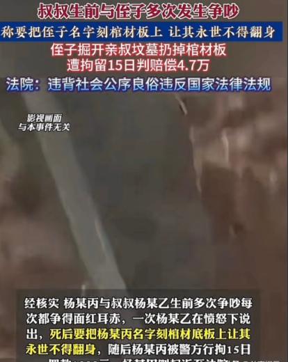 太狠了!四川一男子,生前多次与侄子发生争吵,甚至扬言,死后要将侄子名字刻在自己棺材上,让他翻不了身!不料,男子过世后,侄子竟偷偷将叔叔坟墓挖开,将棺材底板扔进河中,男子家属将侄子告上法庭,法院的判决让人意外! 四川一个不起眼的小村庄里,杨学才是村里有些年纪的人,性格古板而谨慎。他一生节俭,家里院子不大,但整洁干净,屋里也常常堆着几样祖传的小物件。 杨学才有一个侄子,名叫杨红兵,今年二十出头。杨红兵从小就懒散,不爱读书,初中没多久就辍学在家。 他整日无所事事,依靠父母的养活,几乎没有自立能力。村里人常说他是“啃老一族”,不管事、不上进。 杨学才对侄子的懒散态度一直看不惯。 每次见到杨红兵,他总是眉头紧锁,语气严厉地教育他:“你爸妈养你可以,但你不能一辈子什么都不干!总得有点出息,找点事干!”话里话外都充满了责备和担忧。 杨红兵每次听叔叔这么说,脸色就难看,他根本不服气:“我爸妈愿意养着我,你管得着吗?你算老几啊?老是管这管那,烦不烦!” 两人的矛盾就这样一点点积累起来,常常因为一些小事而争吵,甚至吵得面红耳赤,声音大到隔壁邻居都能听见。 杨学才常常把侄子的行为拿出来跟自己哥哥抱怨:“你这孩子不能这么不管不问啊,将来没个正经出息,可怎么办?” 他也常在邻居面前摇头叹息:“这小子真没出息,一辈子苦寒的命啊!”杨红兵无意中听到这些话后,心里生出了越来越多的不满。 他觉得叔叔不但管得宽,还总在外面说他坏话,这让他心里极不舒服。 日子一天天过去,杨学才偶尔会气急败坏地说:“你翻不了身啊,我死了以后,要把你名字刻在我棺材上,让你永远没法得意!” 杨红兵听到这话时,嘴角微微抽了抽,却没有当真,只是心里种下了一个小小的念头。 谁也没想到,这个念头在杨学才去世后变成了实际行动。几天后,杨学才安葬完毕,家人准备出去旅游散心几天。 杨红兵眼中闪过一丝狡黠,他打电话把几个初中时代玩的较好的同学叫来,悄悄地商量了一个计划。 深夜里,杨红兵带着同学们来到叔叔的墓地。他们手里拿着铲子和木棍,四下张望,确保没有人看到,才开始行动。 几个年轻人合作,将墓地周围的泥土一点点挖开,终于挖到了棺材底板。杨红兵看着木板,心中既紧张又兴奋,他小声喊着让大家小心,生怕被家人发现。 随后,他用力把棺材底板搬出,偷偷扔进附近的河里。 事情发生后不久,村里人发现了异样。杨学才家人赶回来时,惊讶地发现坟墓底板不翼而飞,赶紧报了警。民警接警后,展开调查,通过多方走访,很快就锁定了杨红兵的嫌疑。 杨红兵最终被带走,接受调查。警方认定,他的行为虽然违法,但尚未涉及盗窃或者损毁遗骨,因此行政拘留15天,并罚款1000元。 杨学才的家人看着杨红兵仅仅拘留了半个月、缴纳了1000元罚款就回到村里,心里感到非常不满。 他们觉得,这小子既破坏了家人的精神感情,又冒犯了逝去的长辈,处理得太轻了。于是,家人决定通过法律途径再次追究,向法院提起诉讼,要求杨红兵赔偿精神损害费5万余元。 案件审理过程中,法官详细了解了事情经过,听取了双方陈述。 法庭上,杨学才的家人情绪激动,声泪俱下:“我们一辈子辛辛苦苦把家打理好,谁能想到死去的亲人坟墓都被挖开?我们精神上受到极大伤害,这小子太过分了!” 而杨红兵却显得有些漠然,他辩称自己只是想看看棺材上有没有刻上自己的名字,并没有破坏遗骨或者盗窃东西:“我也没想干坏事,只是好奇叔叔说的话是真是假。” 法院审理后认为,杨红兵挖掘叔叔坟墓的行为虽然触犯了公序良俗,应当受到道德谴责,但从法律层面上,并未构成犯罪,属于民事纠纷范畴。 然而,杨红兵的行为的确严重损害了杨学才家人的精神利益,应当承担相应的民事赔偿责任。 最终,法院判决杨红兵赔偿杨学才家人精神损害费47353.87元。
