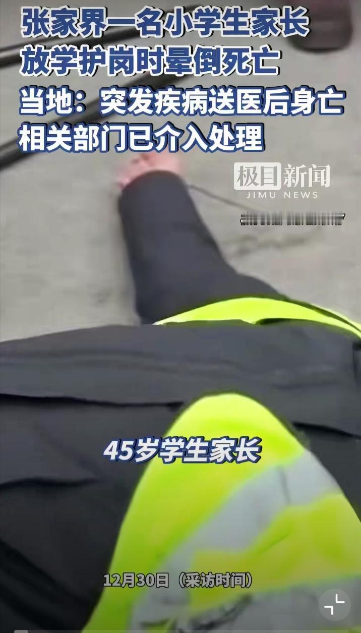 大痛心!张家界一名45岁父亲,在“护学岗”执勤时猝然离世!留下2个未成年孩子。 事发2025年12月29日下午,在张家界永定区一小学门口,一位家长如约参加护学岗执勤任务。上岗后不久,该家长突然晕倒,被发现后紧急送往医院抢救。遗憾的是,医生们竭尽全力,仍回天乏术,再也没有醒来。丢下2个尚未成年的孩子——一个17岁,一个8岁,8岁孩子正是这所小学的在读学生。 家庭的顶梁柱就此崩塌,给家庭的打击无疑是毁灭性的,这份伤痛难以想象。 可事情发生后,学校的相关说法引发广泛争议:校方称该家长站岗时长不足2分钟,但现场监控视频清晰显示,从他上岗执勤到不幸倒下,时长约20分钟;校方还强调,护学岗是自愿参与的服务行为,但多名家长纷纷反应,实际情况并非如此,家委会早已制定了明确排班表,以班级群接龙的方式要求家长轮值。 学校这番言论的初衷不言而喻,可真相面前容不得半点含糊,企图用“自愿服务”的说法削弱或撇清自身责任,不仅让死者家属寒心,更暴露了学校缺乏敢于担当的勇气与应有的责任底线。 这位家长是在护学执勤过程中遭遇不测,且是为学校无偿提供执勤服务,无论是自愿或是隐形强制,出了这样的悲剧,学校都应该积极配合有关部门调查,理清各方责任边界,给逝者家属一个公正满意的答复。 不知从什么时候起,学校悄然兴起什么“护学岗”,让本该由交警或者保安的专业职责转嫁到家长身上。 表面上看是学校倡导,家长自愿,实则是变相的强制摊派。一旦轮到自家执勤任务却没能完成,家长难免担心孩子会受到区别对待,拿到到差评,甚至在同学之间会受到排挤,试问哪位家长会让自己的孩子在学校受到委屈? 这就催生了诸多现实问题:家长们起早贪黑要工作要养家糊口,根本没有充裕时间参与护学执勤,无奈之下,不少家庭只能让年迈的爷爷奶奶顶替上岗,更有家长花钱雇人代岗,以而催生了“护学代岗”的畸形服务。 这些顶替代岗的人员,既没有接受过专业的执勤培训,也没有进行健康筛查,更没有统一购买意外保险,种种疏漏都为安全隐患埋下伏笔。 网友纷纷呼吁:“取缔家长护学岗,这样的护学岗意义何在,只会劳民伤财。”还有网友抛出灵魂拷问:“若是护学岗执勤期间,学生发生意外,护学岗家长需不需要承担法律责任?”。 不可不否认,护学岗初心是为学生安全保驾护航,增强家长与学校的互动,让家长直观感受校园安全环境,传递共同守护的责任。 但是学校更应该换位思考,体谅家长的工作压力,让家长从这伤额外的负担中解脱出来。专业的事交给专业的人去做,唯有如此,才能守住护学的初心,彻底避免类似的悲剧再次重演。