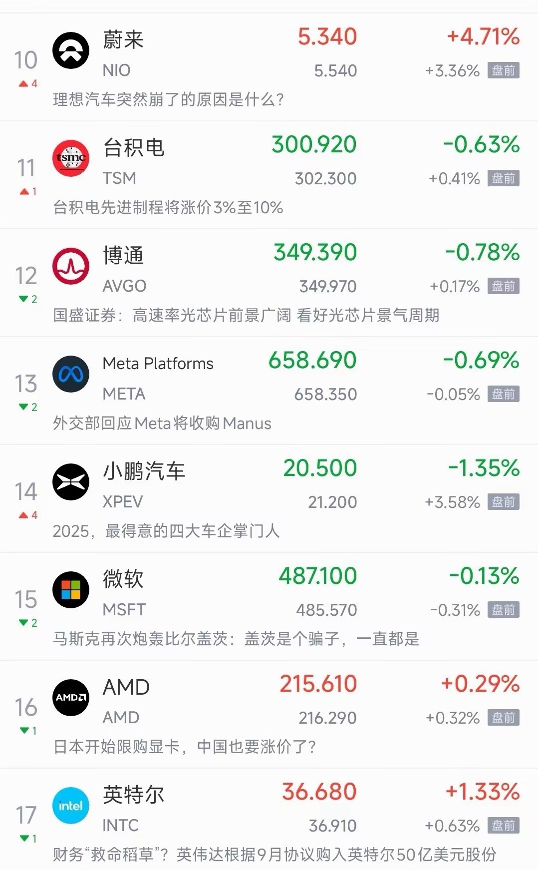 昨日美股要反弹了,今天A股也要发红包了昨晚美股科技股盘前开始反弹了,大型科技股基本上都翻红了,英伟达涨0.16%,特斯拉涨0.51%,AMD涨0.32%,英特尔涨0.63%。人工智能概念的科技股都在涨,也就预示着今天大概率科技股会有反弹。美股科技股的反弹会带动A股科技股的反弹。现在A股科技股才是市场活跃的主要板块,只有科技股涨才是散户真正赚钱的行情。而且今天A股是2025年最后一个交易日,应该会有一个不错的行情,作为2025年的收官之战