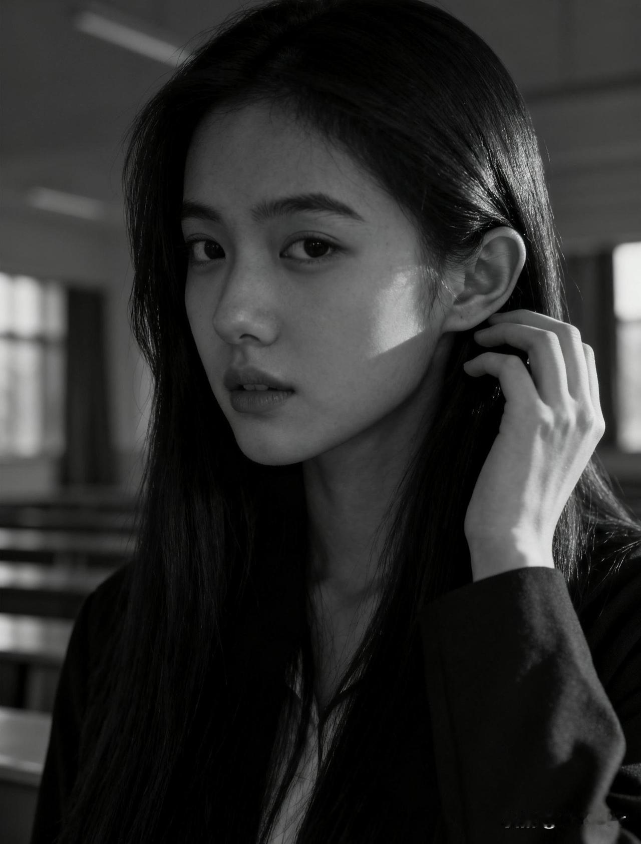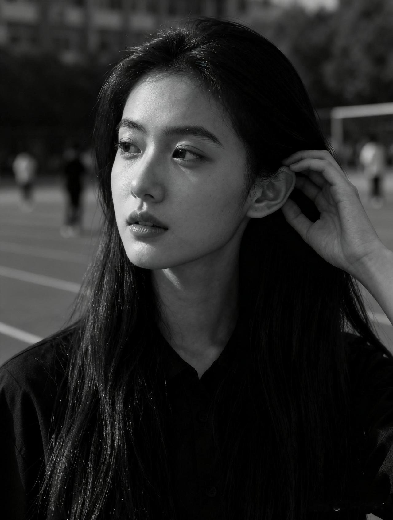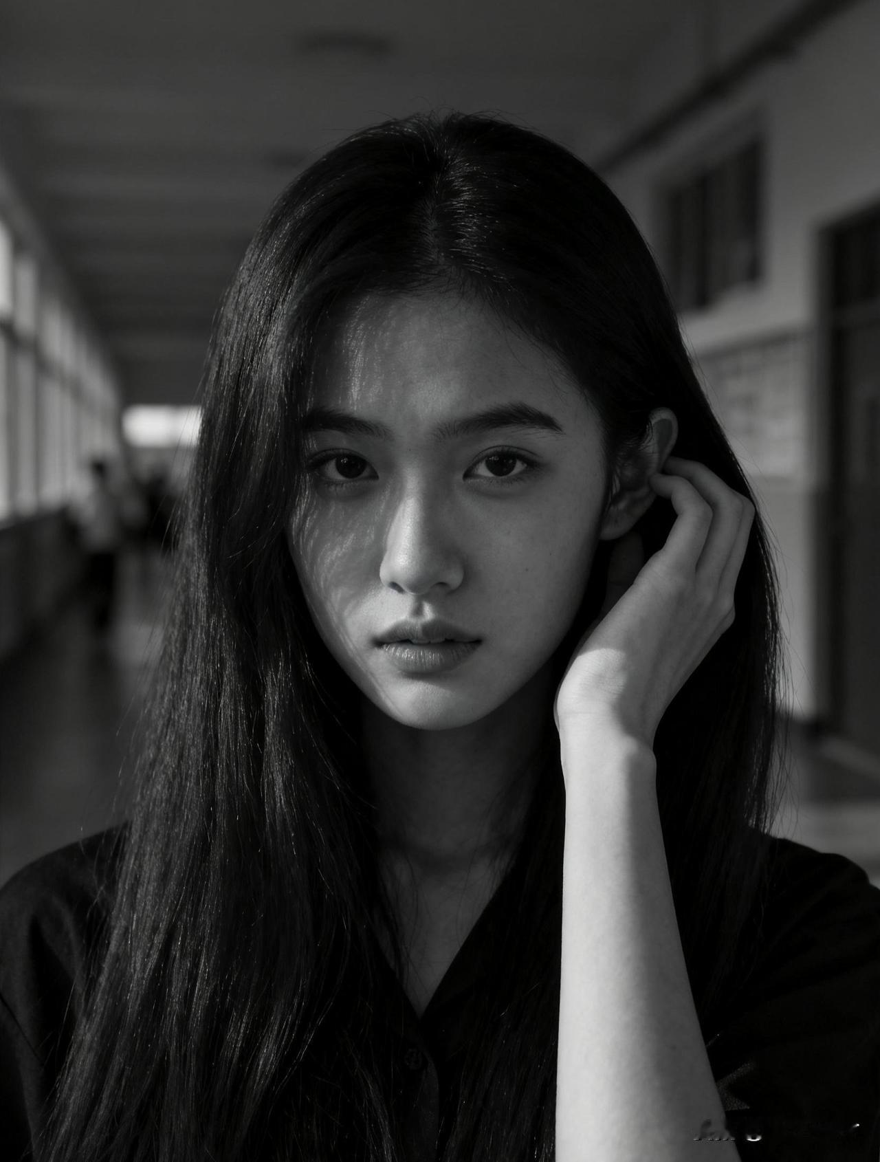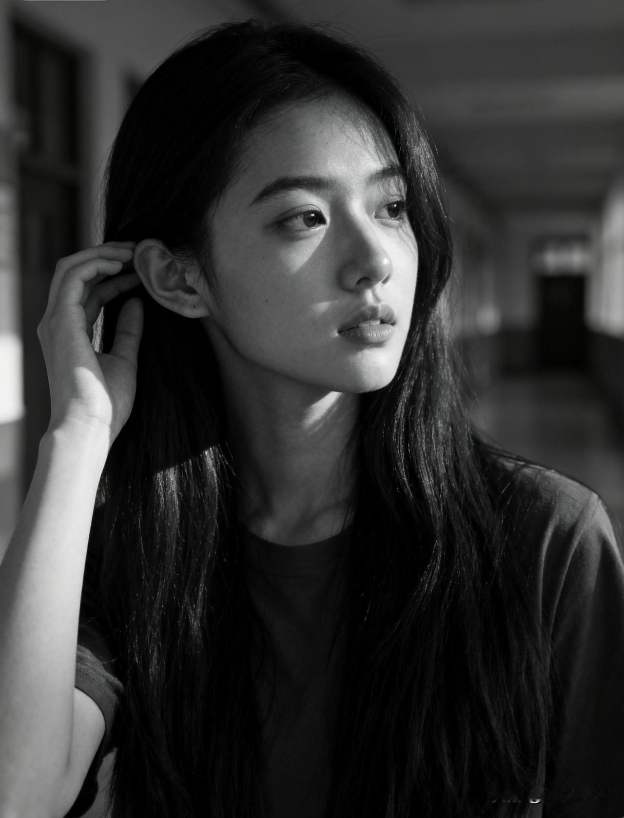 黑白色调下的沉思少女,耳畔轻抚发丝,静谧而深邃。