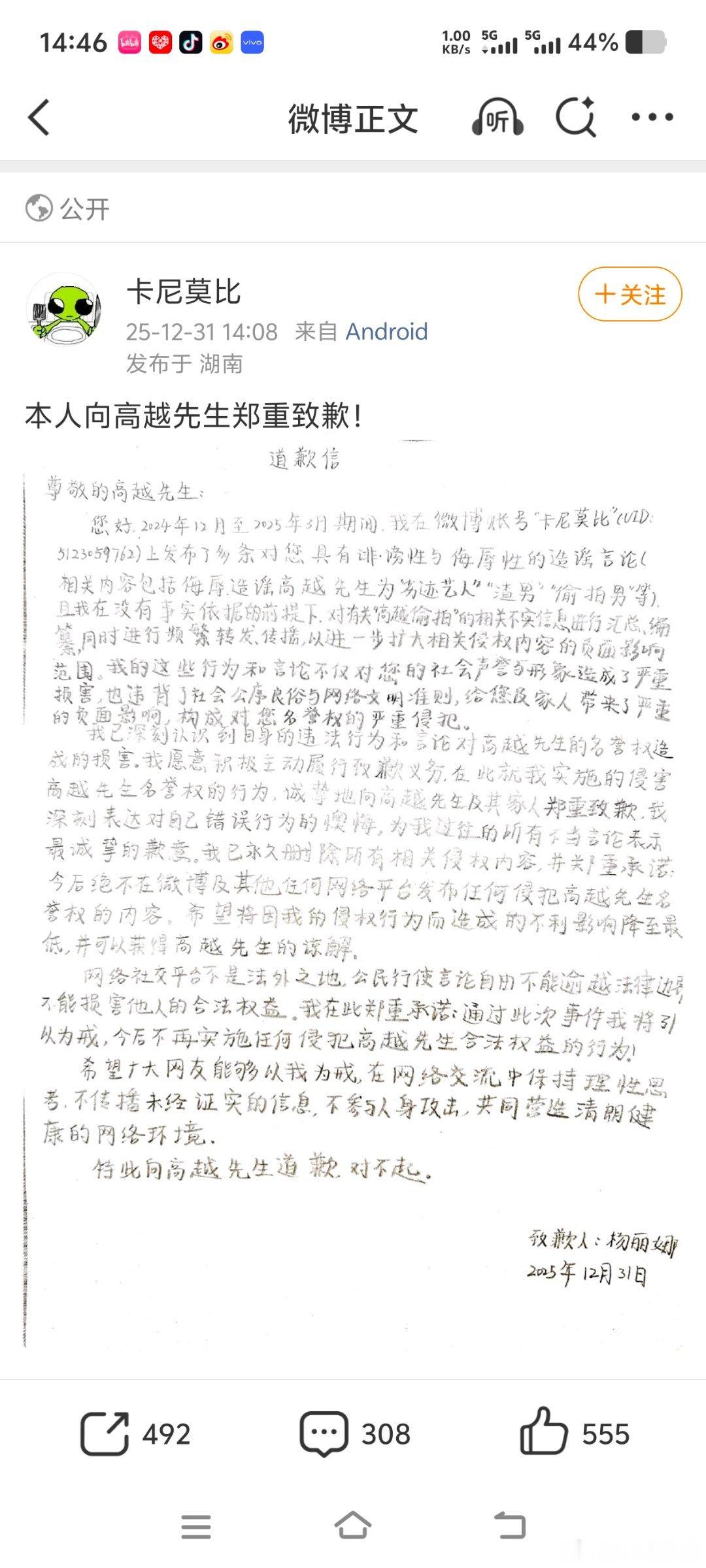 高越造谣者道歉🍊高越黑粉实名手写道歉信好宝,守得云开见月明。“我比流言蜚语更早
