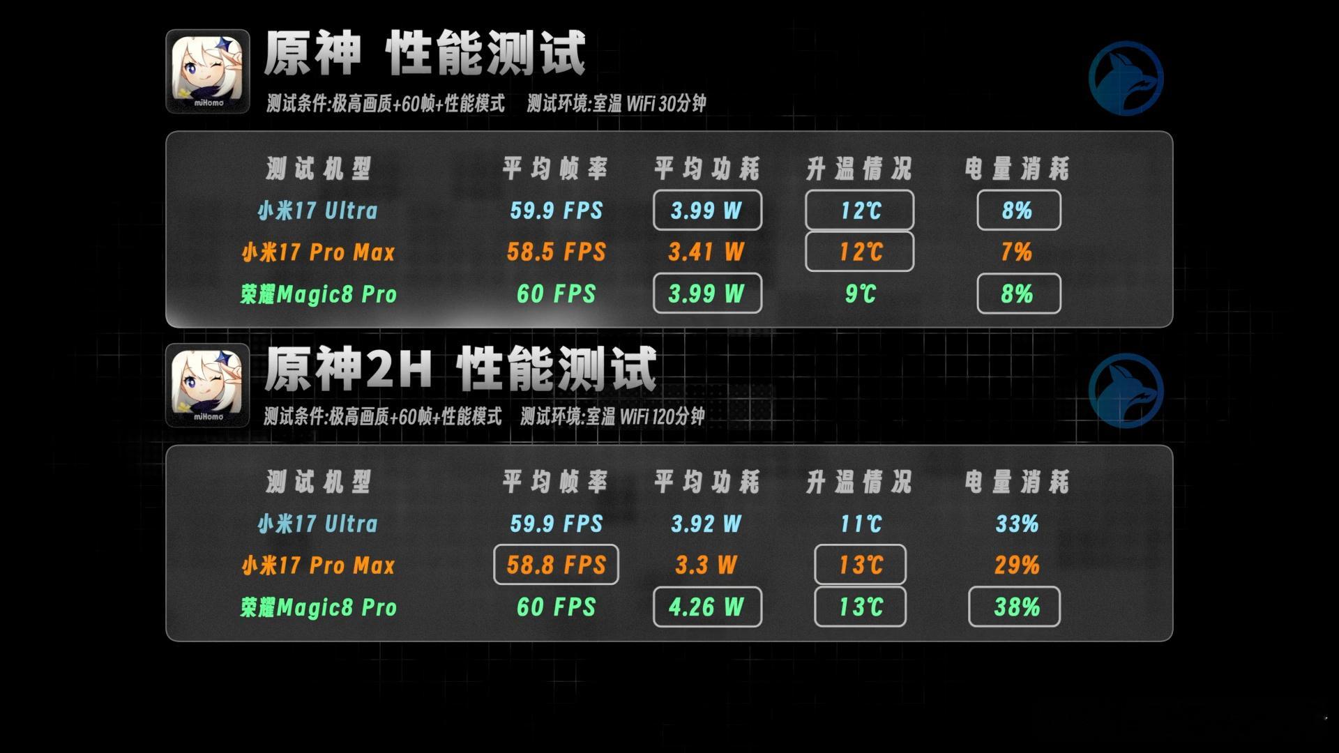之前在测小米17PM的时候说到,米家极致性能还是要交给红米,但没想到这次17U在性能三件套完全一样的情况下,游戏表现提升还挺明显。【王者/吃鸡】(图1)两款低负载游戏都是满帧运行,也保持了较低的功耗,和米17PM以及我们测试中表现比较好的荣耀Magic8 Pro相当,玩着流畅没啥问题。【原神】(图2)这次米17U表现要比17PM好很多,两小时极高画质+60fps枫丹跑图,平均59.9fps,而且过程中没有太明显的卡顿掉帧,能感知到性能释放更强,而且全程没有锁帧。虽然功耗要稍高一些,但还是在正常范围内。不过由于把大部分空间给了影像的原因,我们测试中,半个小时以上的游戏或拍照,机身都有明显发热的情况,这也是Ultra没法避免的。