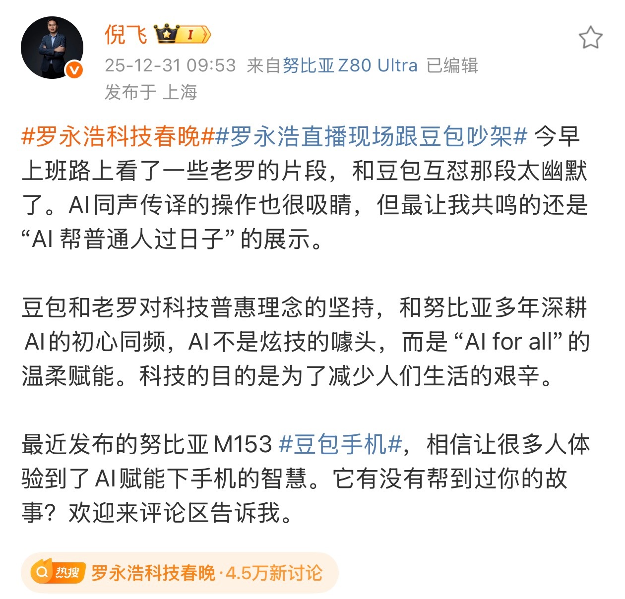 努比亚总裁倪飞点赞罗永浩 倪飞总聊到老罗直播的片段,其实,最触动我的反而是“AI帮普通人过日子”,这其实也就是AI手机的本质,技术不该是参数竞赛,而是融入日常的觉察与体贴。真正的AI手机,应像一位沉默的伙伴,在需要时恰当地出现,无论是实时翻译、无障碍沟通,还是主动提醒。它让技术回归到“为人减负”的初衷。正如豆包手机所尝试的,让AI成为每个人触手可及的温柔助力,你们觉得呢?