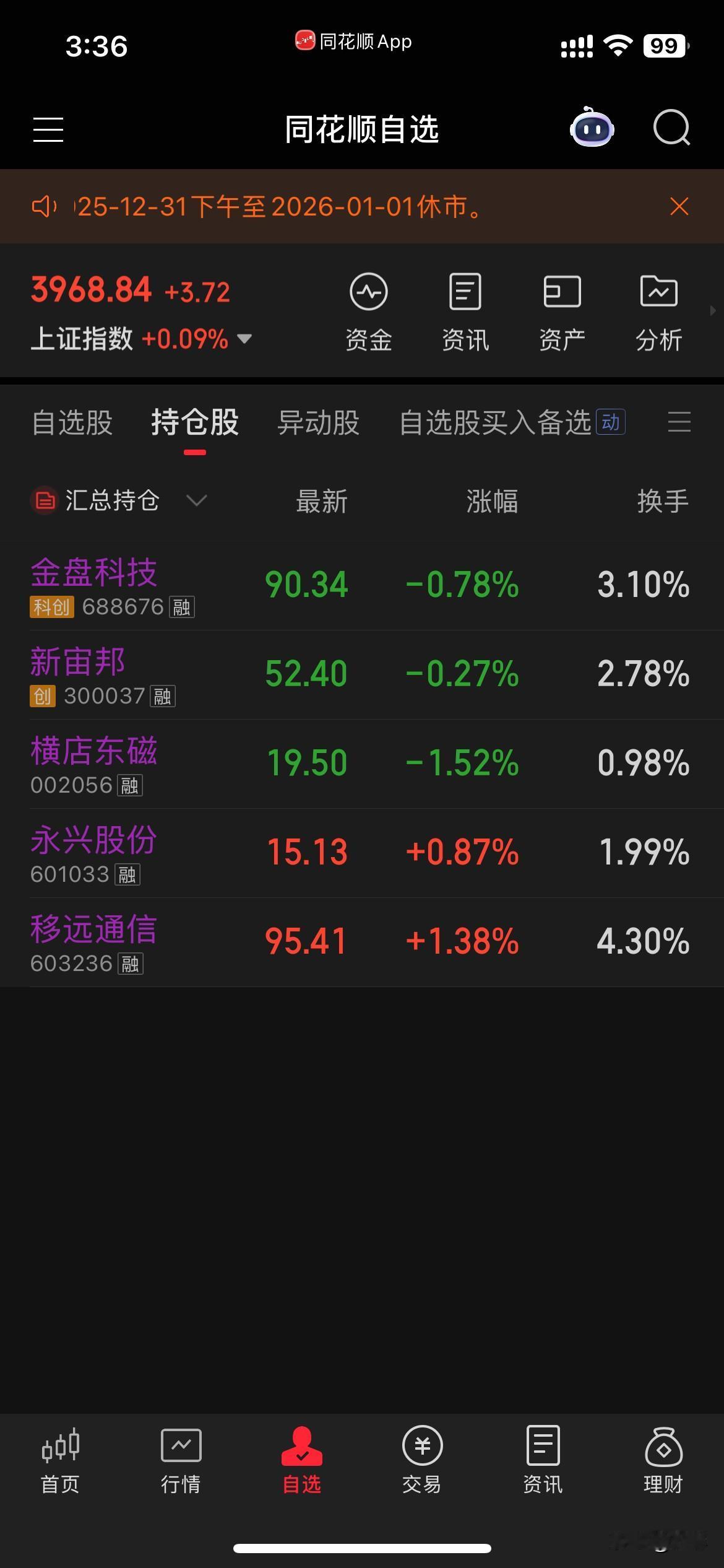 下午没有等来红包[酷拽],也没有操作。持股过年了。 收盘绿了几十块。本月还行,今年一般般没赚到什么钱。希望明年更上一层楼
