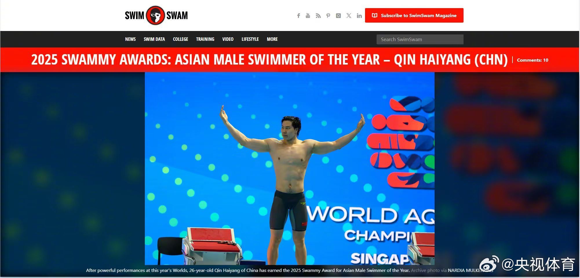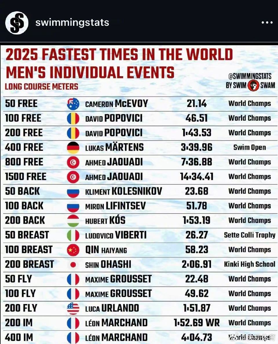 #覃海洋李冰洁获评亚洲最佳游泳运动员#知名游泳专业媒体SwimSwam公布2025年度亚洲最佳运动员评选结果,中国选手覃海洋和李冰洁双双当选!同时,该媒体确认,覃海洋在新加坡世锦赛男子100米蛙泳决赛中,游出58秒23夺冠,创下该项目2025赛季长池世界最好成绩。
