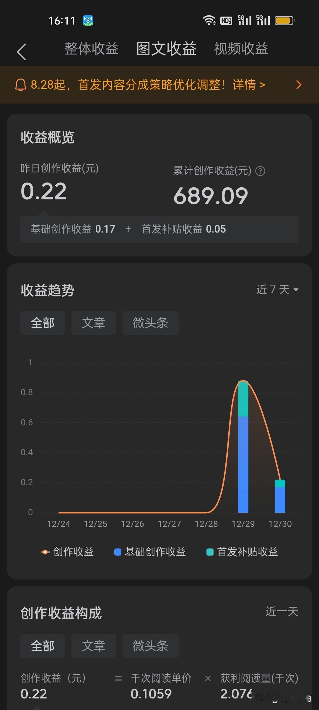 来头条五个月了,刚开始看别人晒收益所以才来的,目的也是挣点生活费。 可现实狠狠地给我上了一课,头条收益并不是谁都能挣的。 我承认别人很优秀,也确实挣到了。自己为什么没有? 其实很简单,文笔不够,认知不够,内容没有深意,不能引起读者的共鸣。 至于头条很多人讲的要多去串门,这样流量自然就来了,我想说那是在相互取暖而已,并不能给你带来多大阅读量。 我关注了好几个大咖,人家的文章微头条经常十几万+的阅读量,可是人家连自己的评论区都懒得回复,知道为什么嘛? 大咖的时间是用来优化自己文章的,并不是所谓的去串门拉阅读量的。 只要你的作品有深度,文本流畅,前有钩子,后有争议,恭喜你,成功了,但不是所有人都有那个水平。 所以文章不在多而在精,用心打磨一篇胜过千篇一律。加油头条人。