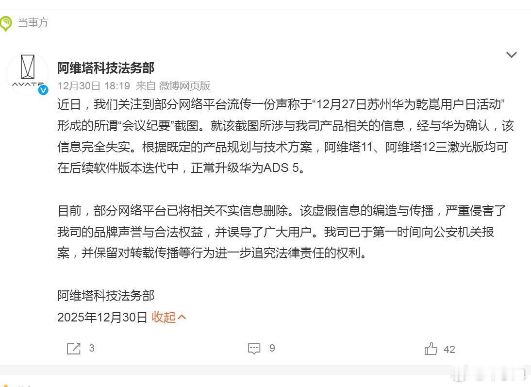 之前有流传的截图声称,“阿维塔11、12三激光版无法升级华为ADS 5智驾”,现在阿维塔官方已经站出来辟谣了,该信息完全失实,截图是伪造的。根据阿维塔的产品路线图,阿维塔11、12三激光版都已经进入华为ADS 5智驾的升级计划,后续会通过OTA升级方式进行升级。从技术角度上来说,每一次升级都是依靠预留的软硬件接口来实现的,阿维塔11、12都是品牌的旗舰车型,在技术支持上也必然考虑到了未来规划。所以也建议某些人(或者是友商),不要在背后搞事情…..阿维塔报案阿维塔辟谣无法升级华为ADS5