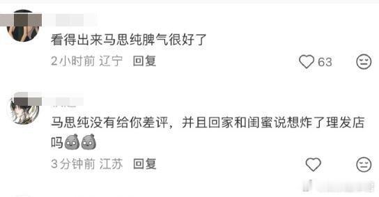 马思纯烫发得出马思纯脾气很好了!有理发师晒了一张给马思纯烫完头发之后的合照,照片里马思纯比着赞微笑,但一头卷发的效果实在不敢恭维,不仅年龄感暴增,整个人也土里土气的,仿佛演我新年去理发店,做发型失败的概率高达99%.理发师可能还想美美等夸呢,结果评论区全是吐槽的!