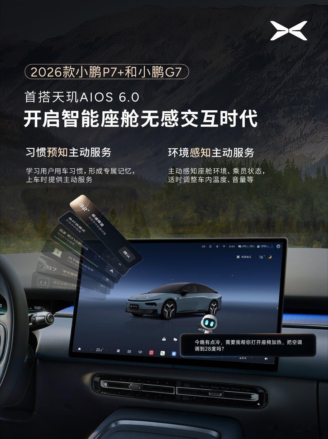 小鹏汽车全球首发主动服务座舱新款小鹏P7+和G7开启智舱无感交互时代首发!2026款小鹏P7+和小鹏G7全球首发搭载天玑AIOS 6.0,搭载全球最大有效算力750TOPS,是行业首个落地的主动服务座舱,采用行业首个端侧座舱视觉语言大模型。