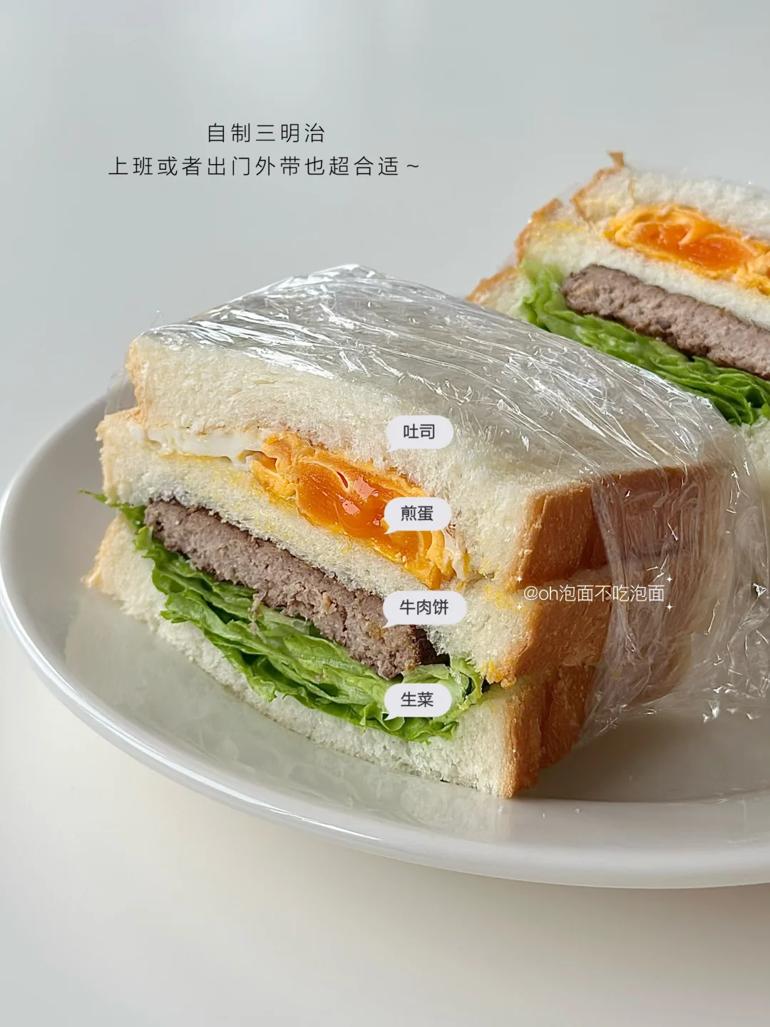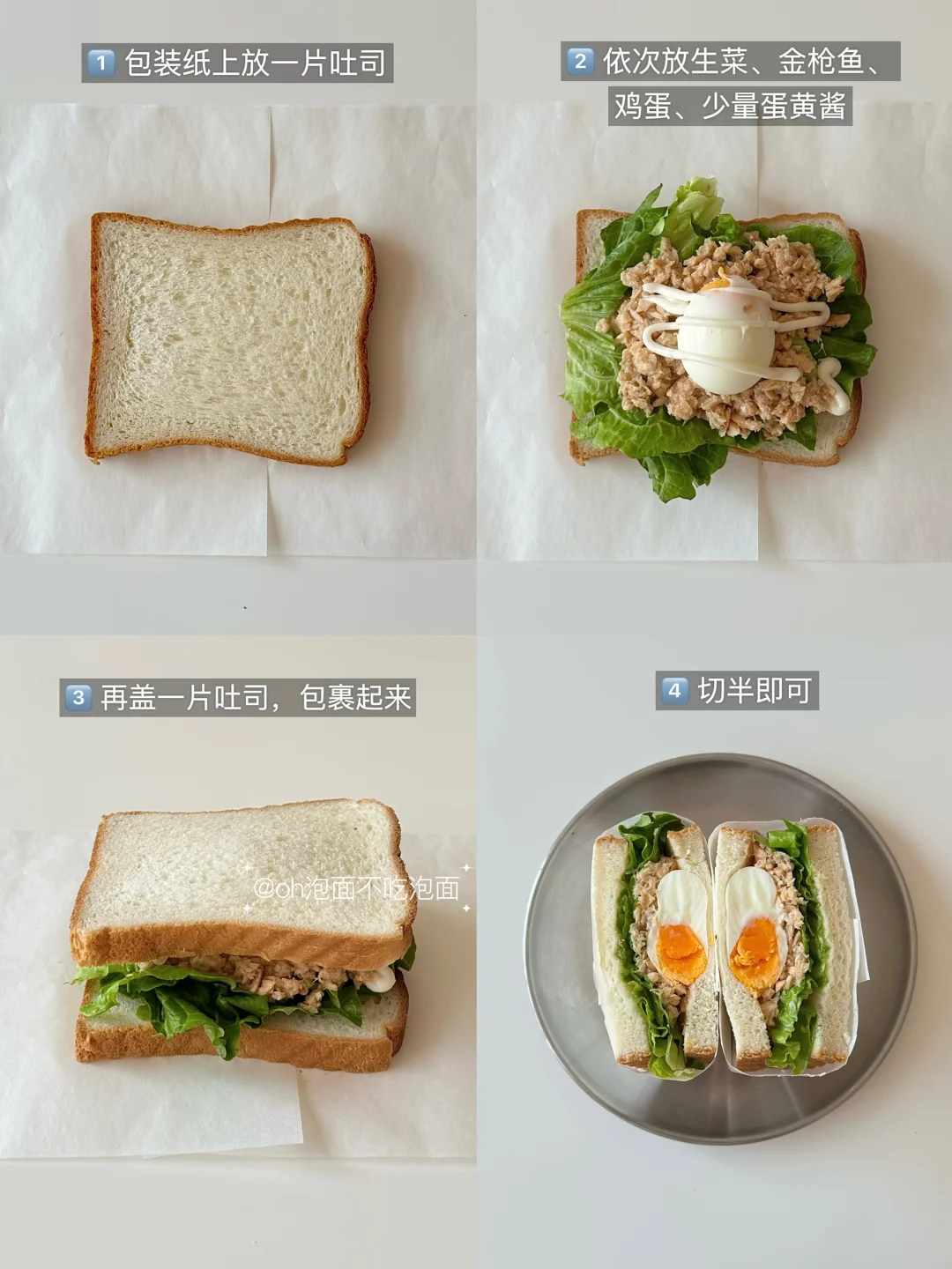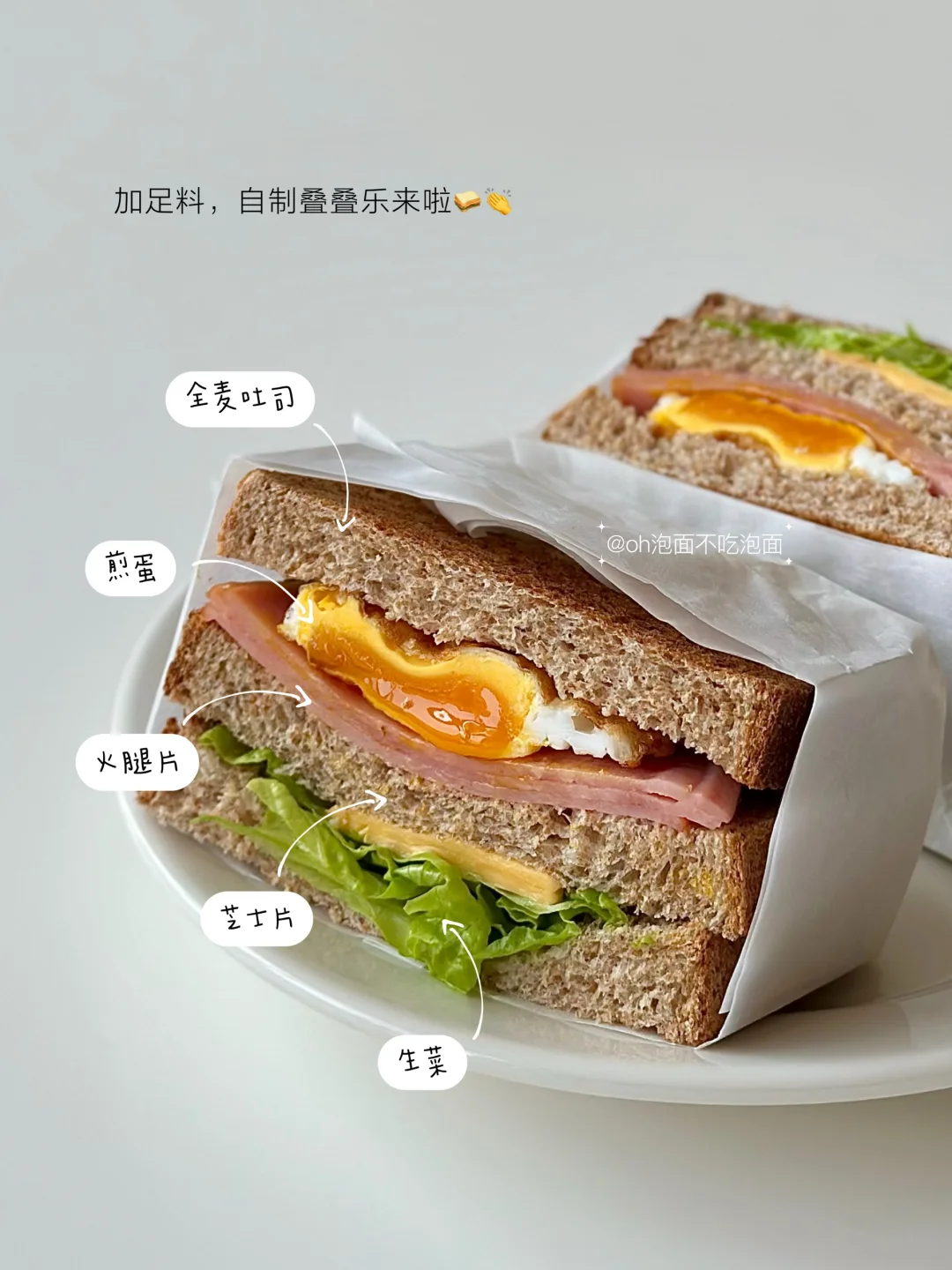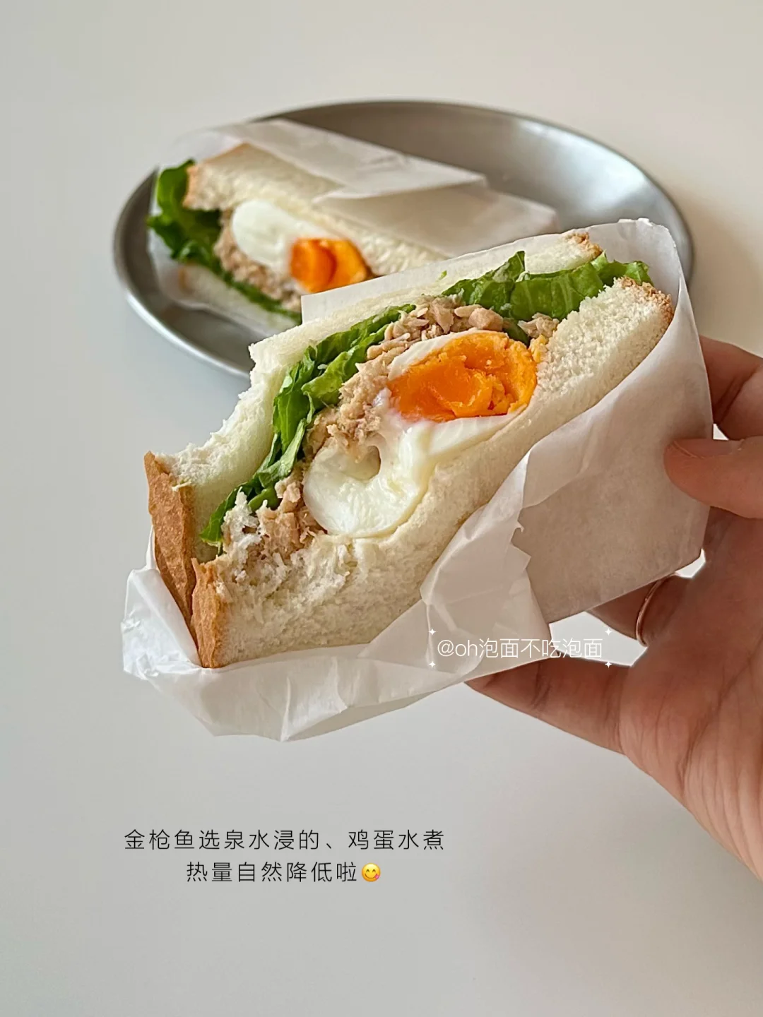 简单快手不重样 把自己喜欢的食材组合搭配 你会get一个加足料的叠叠乐,方便又顶饱~ 减肥也要吃好吃,注意量就好‼️ ✅ 金枪鱼鸡蛋三明治 ✅ 黄桃酸奶三明治 ✅ 牛油果鸡蛋三明治 ✅ 金枪鱼三明治 ✅ 牛肉饼三明治 ✅ 火腿煎蛋三明治