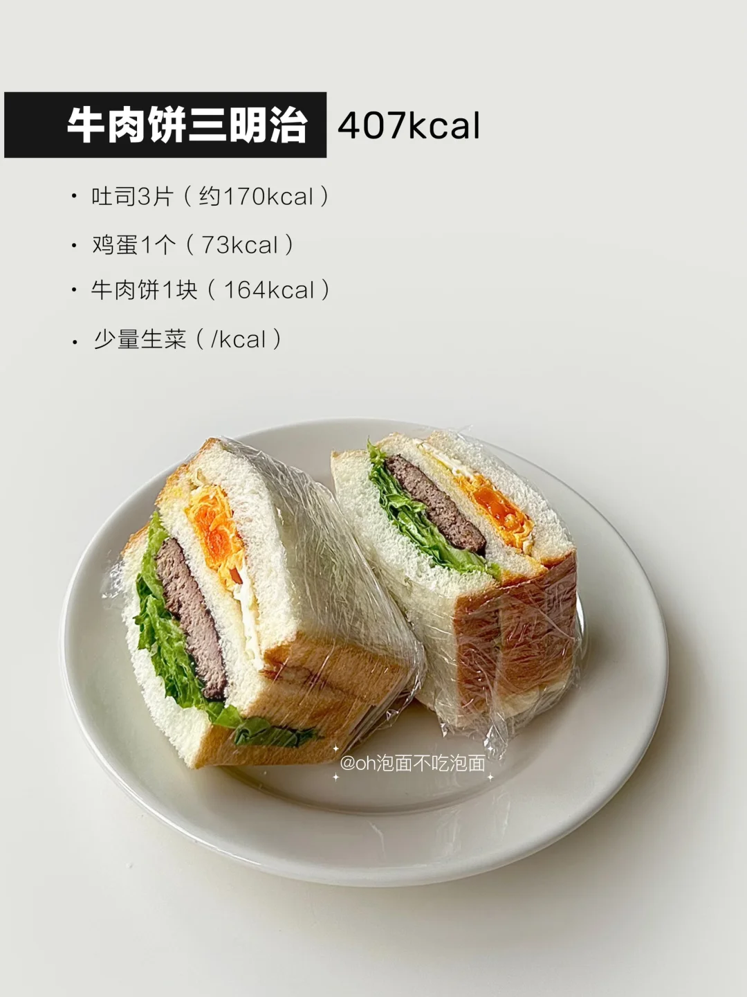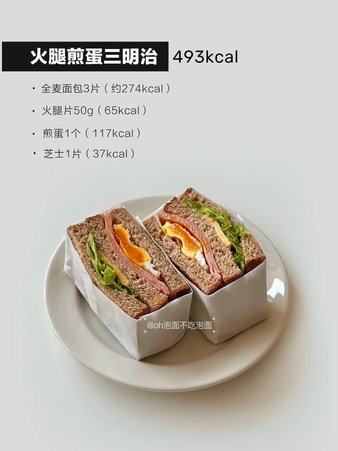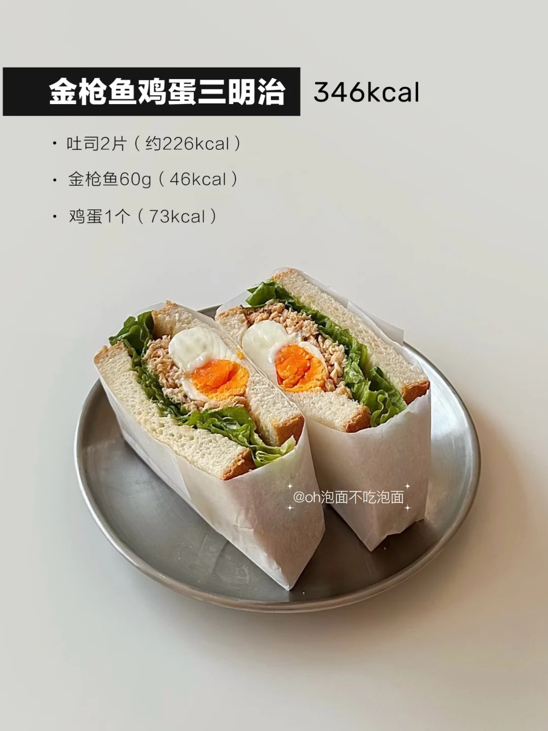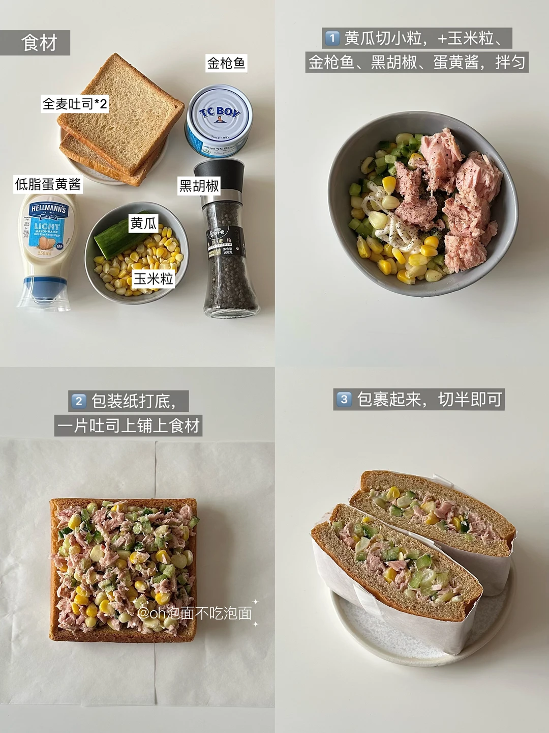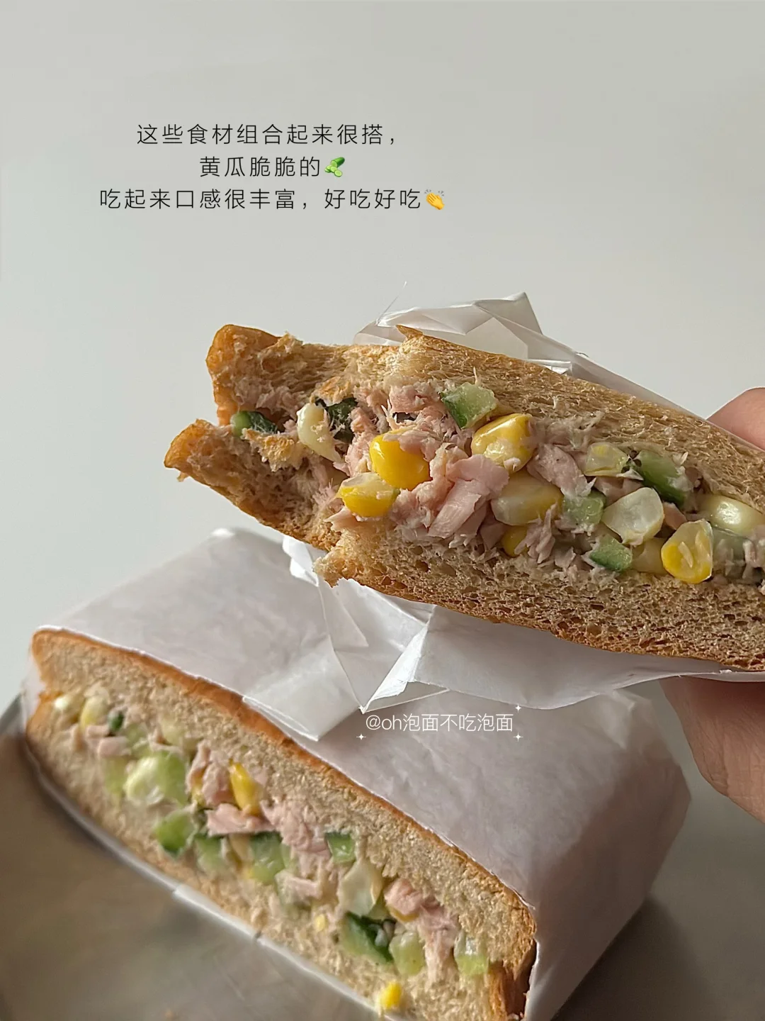 简单快手不重样 把自己喜欢的食材组合搭配 你会get一个加足料的叠叠乐,方便又顶饱~ 减肥也要吃好吃,注意量就好‼️ ✅ 金枪鱼鸡蛋三明治 ✅ 黄桃酸奶三明治 ✅ 牛油果鸡蛋三明治 ✅ 金枪鱼三明治 ✅ 牛肉饼三明治 ✅ 火腿煎蛋三明治
