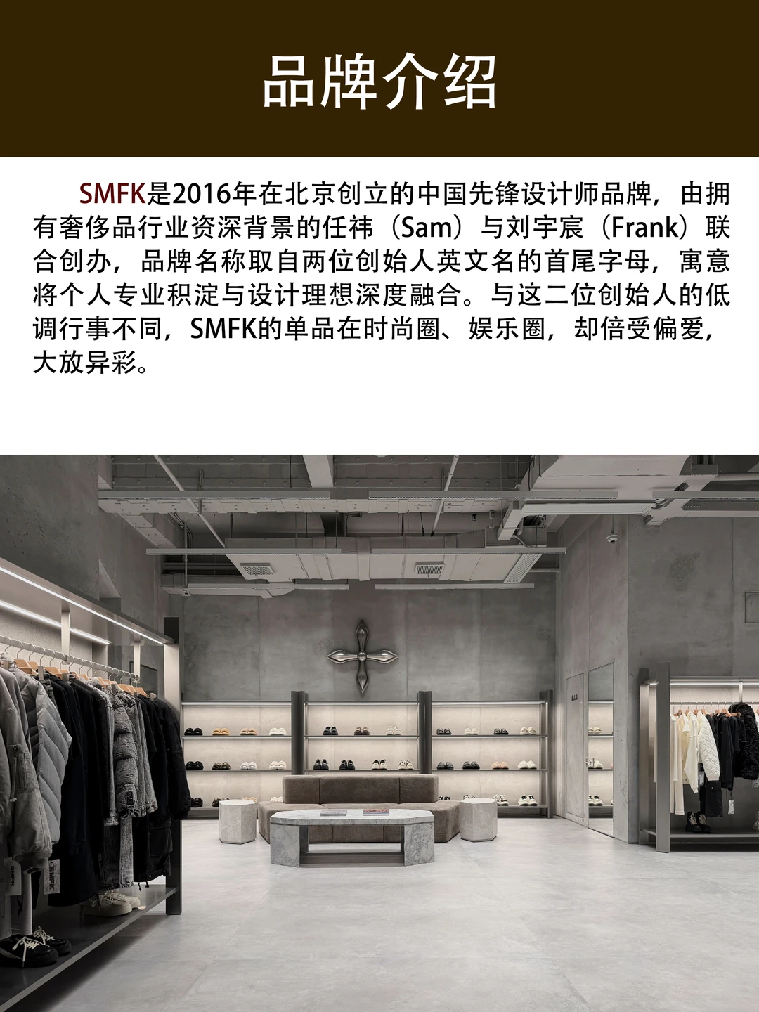 SMFK是2016年创立于北京的中国先锋设计师品牌,[哇R]由奢侈品行业资深人士任祎(Sam)与刘宇宸(Frank)联合创办,品牌名取自二人英文名首尾字母[斜眼R]。
