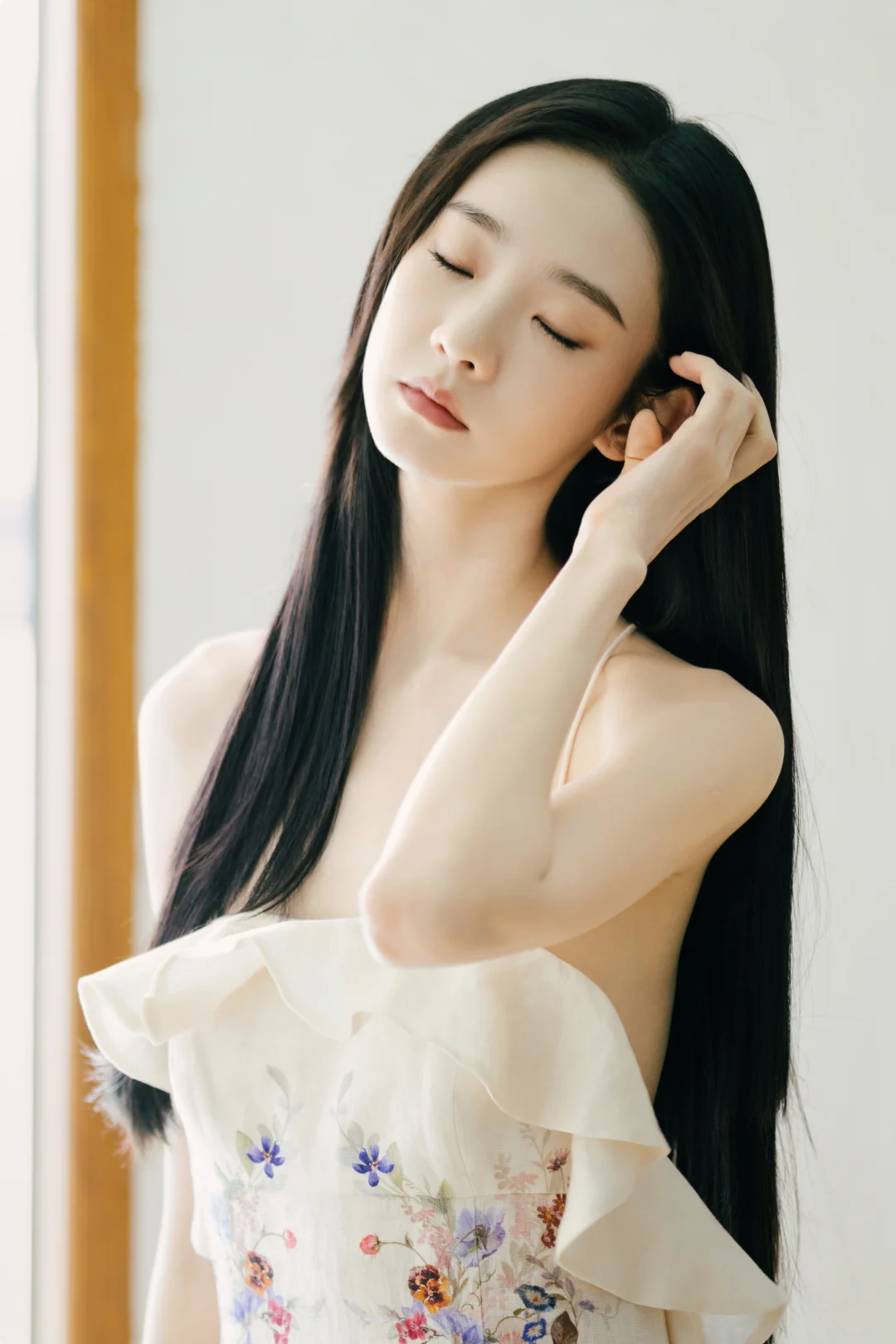 一袭粉缎抹胸长裙裹着柔光,吴宣仪的肩颈线条与锁骨曲线美得恰到好处,是行走的春日甜