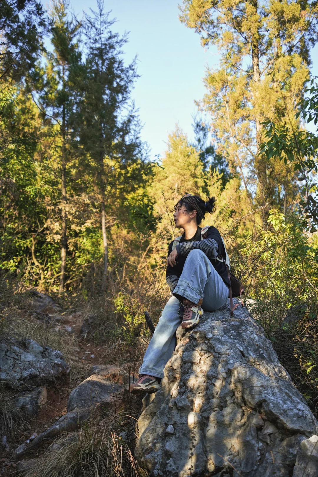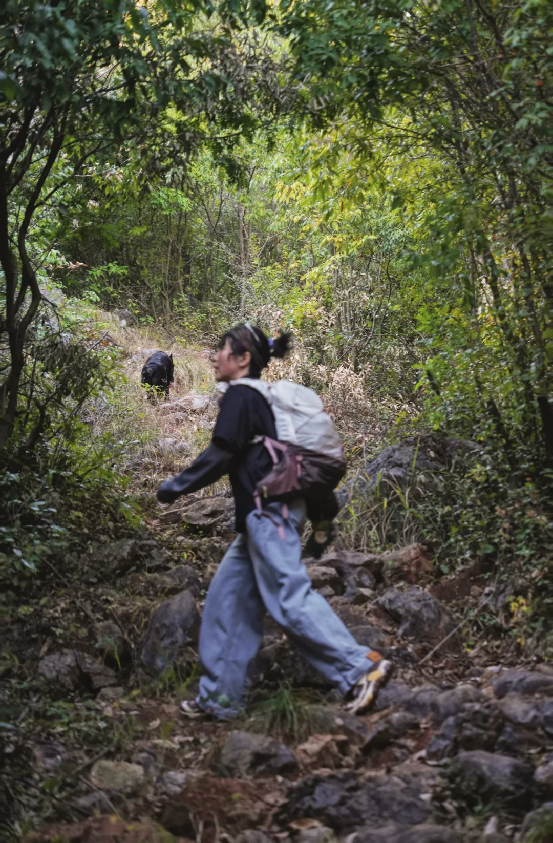 踩着石块往上徒步