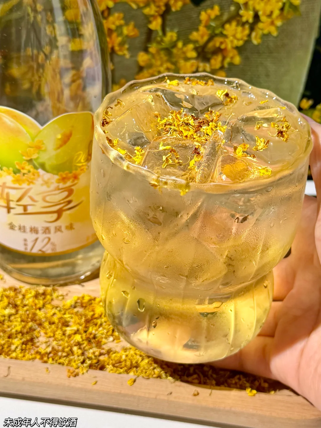 这杯是“中式微醺甜品酒”!金桂梅酒的青梅酸甜,加上桂花蜜的香甜和酒酿的糯香,层次感超丰富!酒感很柔和,12度喝到微醺,撒上干桂花颜值拉满~