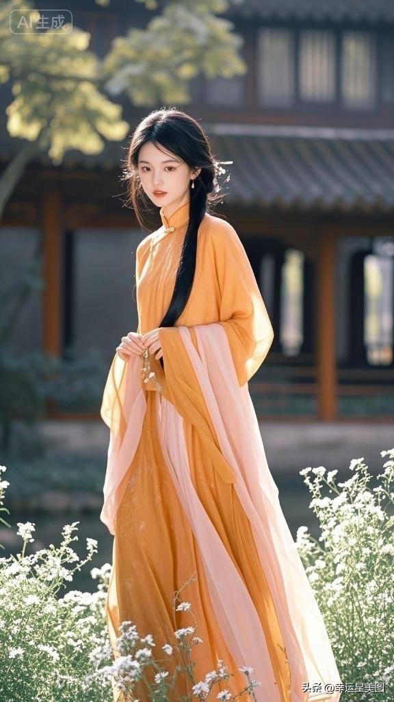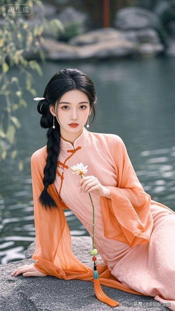 古风少女,静坐湖畔,手持白花,悠然自得。