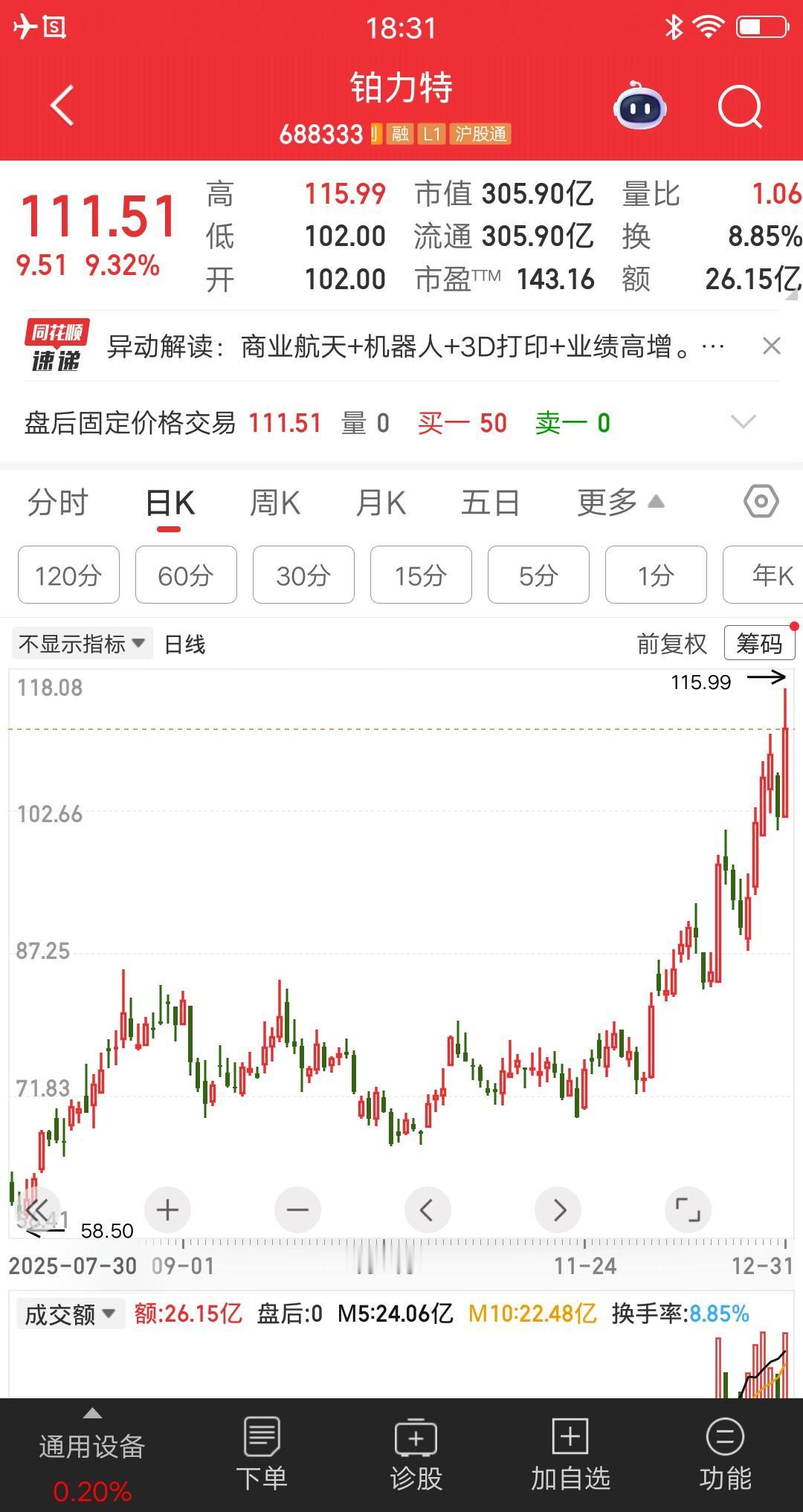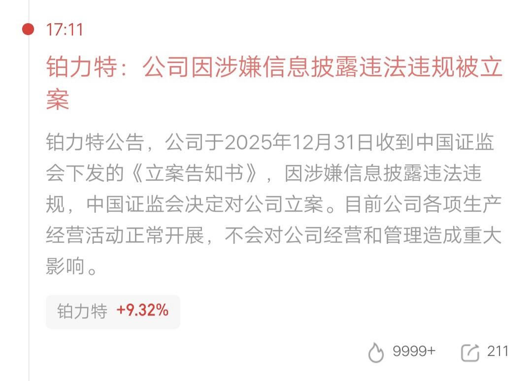 人倒霉起来喝凉水都塞牙 1.57万散户踩雷,账户要大亏了 铂力特:公司因涉嫌信息披露违法违规被立案 公司有商业航天概念 目前股价被炒的很高 今天还创下了历史新高 按照以往的经验,大跌是大概率的事了 高位买入的资金,要吃大面了 这种突发利空事件,几乎无可避免 保持乐观心态吧