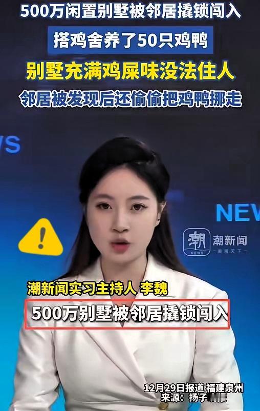 “必须严惩!”福建一男子冬至回老家祭祖,竟发现自家500万建造,长期闲置的别墅,竟被邻居撬锁闯入,并私自改造成了地下鸡舍!导致屋里搞得臭气熏天,墙壁地面糊满粪便。气得男子直接报警!网友:邻居脸皮也太厚了! ​​“陈哥,你城里房子那么多,这乡下老屋空着也是空着,我养几只鸡怎么了?”当警察上门询问时,撬锁占用别墅的邻居老林(化名)站在自家门口,非但没有愧色,反而对着从泉州赶回来的房主陈先生,理直气壮地抛出了这句话。 这话听着就让人火冒三丈!房子再多也是陈先生的合法财产,空着不代表可以被随便侵占,这根本不是“养几只鸡”的小事,而是赤裸裸的违法行径。 陈先生这栋别墅2000年左右建成,投入高达500多万,原本整洁的地下室被搭了三四个鸡舍,养着四五十只鸡鸭,到处是鸡粪和老鼠脚印。 更过分的是,警方立案后,老林还三番五次潜入别墅转移物品,甚至换掉了配套储藏间的门锁,完全没把法律放在眼里。 让人揪心的是,这不是陈先生第一次遭此横祸。两年前他同村的闲置厂房,就曾被人破锁用来养殖家禽,投诉后竟不了了之。 老林的行为早已超出邻里纠纷的范畴。律师明确指出,他未经允许撬锁闯入,已涉嫌非法侵入住宅罪,可能面临三年以下有期徒刑或拘役。 《民法典》早就写明,私人合法财产受法律保护,禁止任何组织或个人侵占、破坏。老林的“空着也是空着”,根本就是无视法律的强盗逻辑。 新疆就有类似案例,戚某霸占对门空置房屋三年,最终被判赔偿房屋占有使用费和维修费共计3万元。法律从不会纵容这种侵权行为。 陈先生的别墅如今装修严重损毁,异味浓烈到无法居住,后续消杀和翻新都要花费巨额费用。这损失,理应由侵权者全额承担。 邻里之间本该互帮互助,可老林却把别人的宽容当纵容,把他人的财产当自己的便利场。这种突破道德底线、挑战法律权威的行为,必须严惩。 没有谁的财产是可以被随意侵犯的,无论是闲置的别墅还是普通住宅,所有权都受法律硬性保护。老林的态度,比鸡舍的恶臭更让人难以接受。 各位读者你们怎么看?欢迎在评论区讨论。