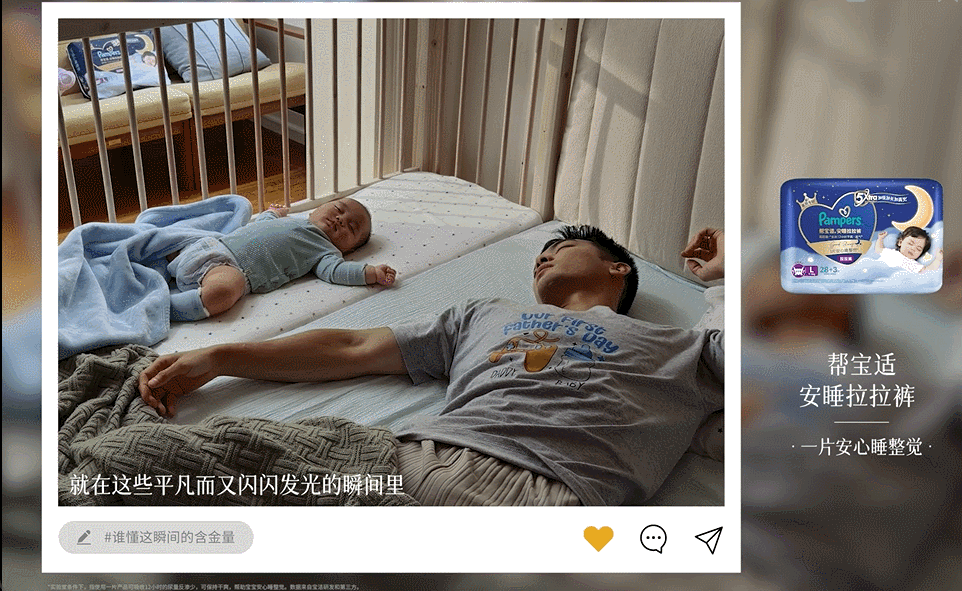 宝洁短片里宝宝整夜安睡的画面真实到让人泪目。当了父母的都知道,摸到帮宝适那一夜干爽的触感,就是无声的胜利宣言。爸爸倒头就睡,妈妈偷得片刻安宁——“人类幼崽续航结界”成功开启,这哪是尿不湿,这是全家人的睡眠自由通行证。含金量,藏在每一个不被夜醒打断的梦里。新的一年,让帮宝适继续守护这份安心的重量。谁懂这瞬间的含金量