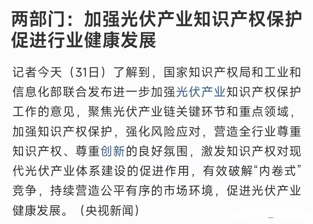 A股刚刚收盘,光伏板块迎来重磅利好,有能力的公司将会受到保护光伏这几年之所以产能过剩,就是一些没有能力研发的公司靠抄袭技术复制出来很多落后的产品,以至于市场被冲击,光伏行业也因此出现较大的波动。现在政策来了村里就是要保护知识产权,打击那些靠抄袭生产懂王公司,已达到平衡光伏产能过剩的问题。这次打击肯定会使很多靠复制的企业受到严重影响,甚至倒闭,间接的保护了整个光伏行业。会使打价格战的行为再次得到遏制,促进光伏产业健康平稳发展。