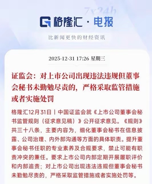 晚间,证监会发布重磅消息,董秘也要被监管了简单的解释就是证监会要给上市公司董秘立专门规矩了,核心就是“权责对等、失职追责”。以前董秘并没有明确的职责,只要不违法基本上就是发布公司的消息,得过且过,没有人能够说什么。现在董秘规定了是公司的高管,必须够专业、不能兼着有冲突的岗位,而且公司内部要定期考核董秘履职情况,不会让董秘尸位素餐了,最重要的是如果做不好,证监会会追责。其实这次规定了董秘的职责还是为了保护投资者,让披露信息更加的真实有效,让投资放心投资,也不会被消息面忽悠。