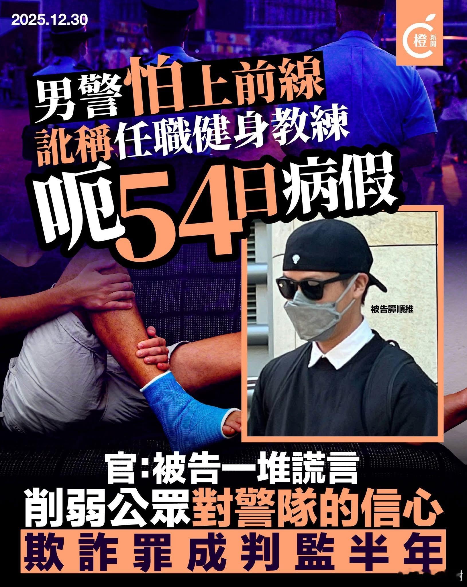 向医生讹称任职健身教练呃病假 男警欺诈罪成判监半年港闻热点观点 一名男警涉嫌在2019年向医生虚报任职健身教练,骗取54日有薪病假,被控一项欺诈罪,早前经审讯后,今日在西九龙裁判法院被裁定罪名成立,被判入狱半年。32岁被告谭顺维,报称警员,被控于/或约于2019年10月17日,向曾文谦医生虚假地表示身为健身教练,不可能从事轻量工作,意图诈骗而诱使曾文谦医生建议放病假54天,由2019年12月13日至2020年2月4日,而导致其获得利益,或使香港警务处或香港特区政府蒙受不利。裁判官裁决时指被告口供不可信,「一堆谎言」,被告犯案是因为社会运动不想上前线,当时警员疲于奔命,被告的行为削弱公众对警队的信心。被告属有计划犯案,在首次求诊时已向医生讹称任职健身教练,直到最后一次覆诊时仍坚称是健身教练。辩方求情称,被告在2013年加入警队,属家庭经济支柱,与妻子育有两名子女,被裁定罪成后前途尽毁,涉案金额仅约4.6万元,而被告获批病假后在家休养,并非做兼职或外游。