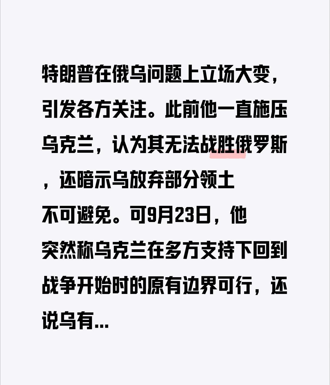 特朗普在俄乌问题上立场大变,引发各方关注。此前他一直施压乌克兰,认为其无法战胜俄罗斯,还暗示乌放弃部分领土不可避免。可9月23日,他突然称乌克兰在多方支持下回到战争开始时的原有边界可行,还说乌有机会恢复边界线。 克里姆林宫驳斥他受乌领导人影响、搞错状况,强调俄经济稳定,推进有战略考量,乌才处于防守。特朗普态度转变或因俄罗斯,过去半年多美施压、他与普京交流,俄立场不变,空袭未停。这立场之变背后,是复杂的国际政治博弈,也给俄乌局势增添了新变数。